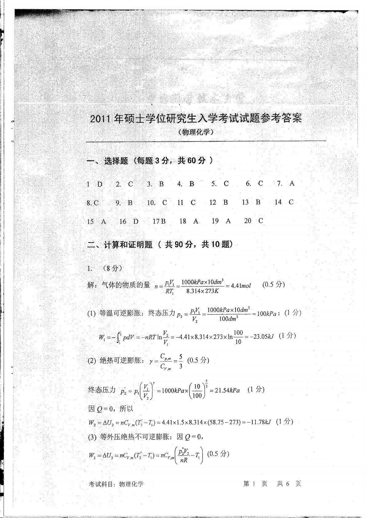 中国科学技术大学621物理化学2011年真题答案
