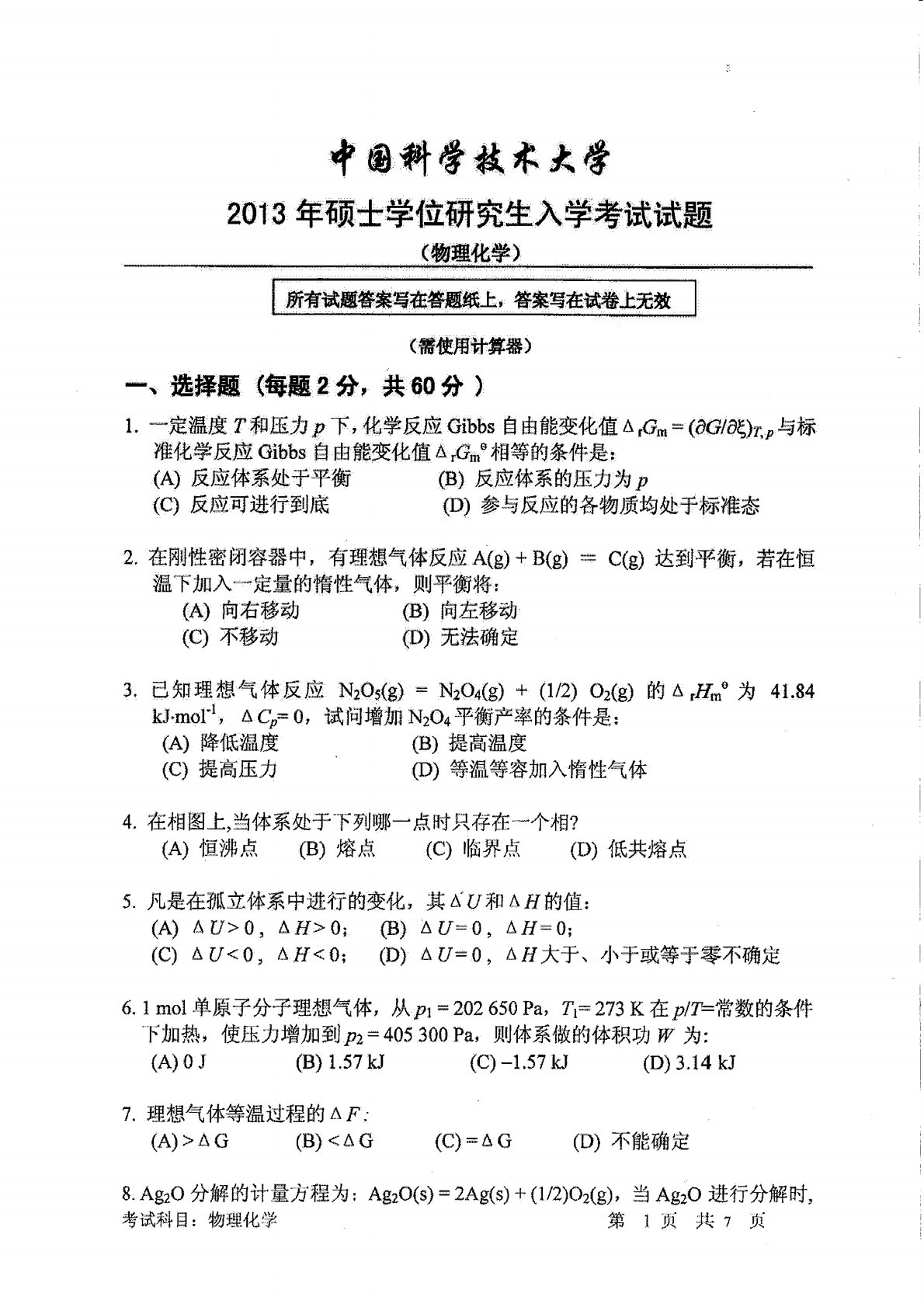 中国科学技术大学621物理化学2013年真题