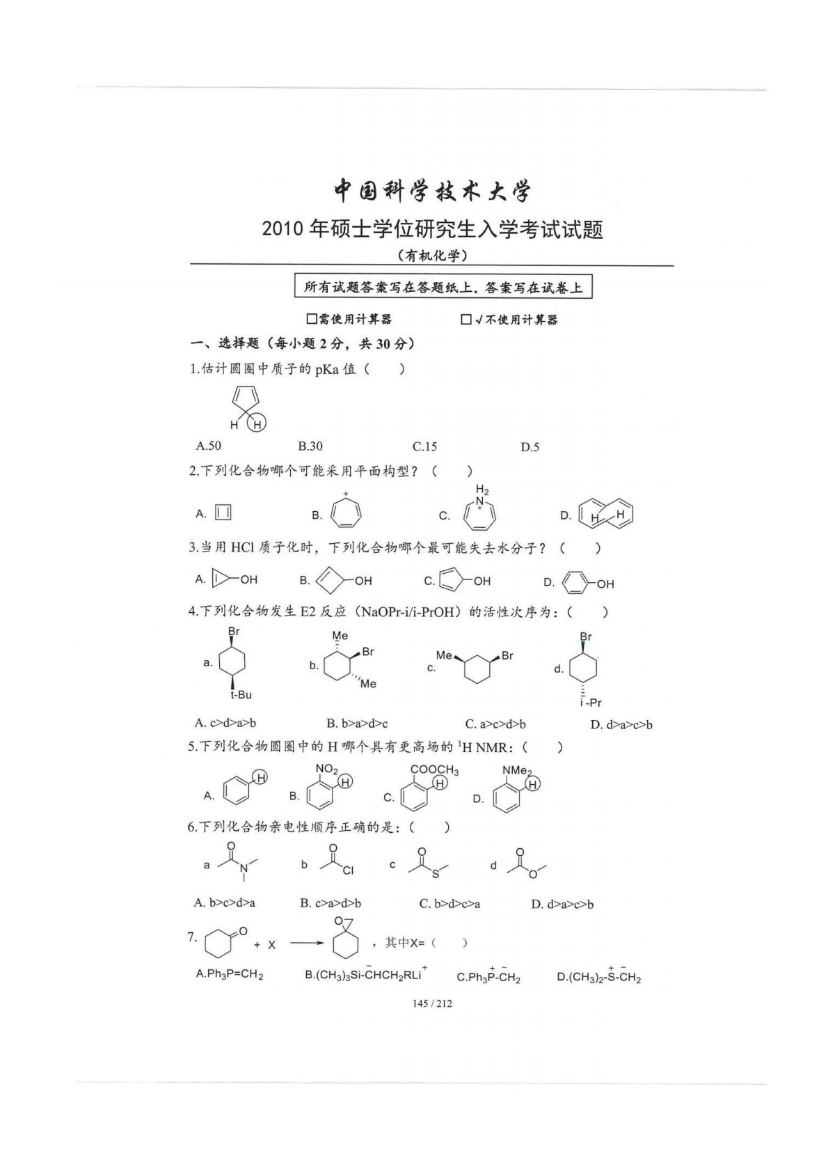 中国科学技术大学854有机化学2010年真题