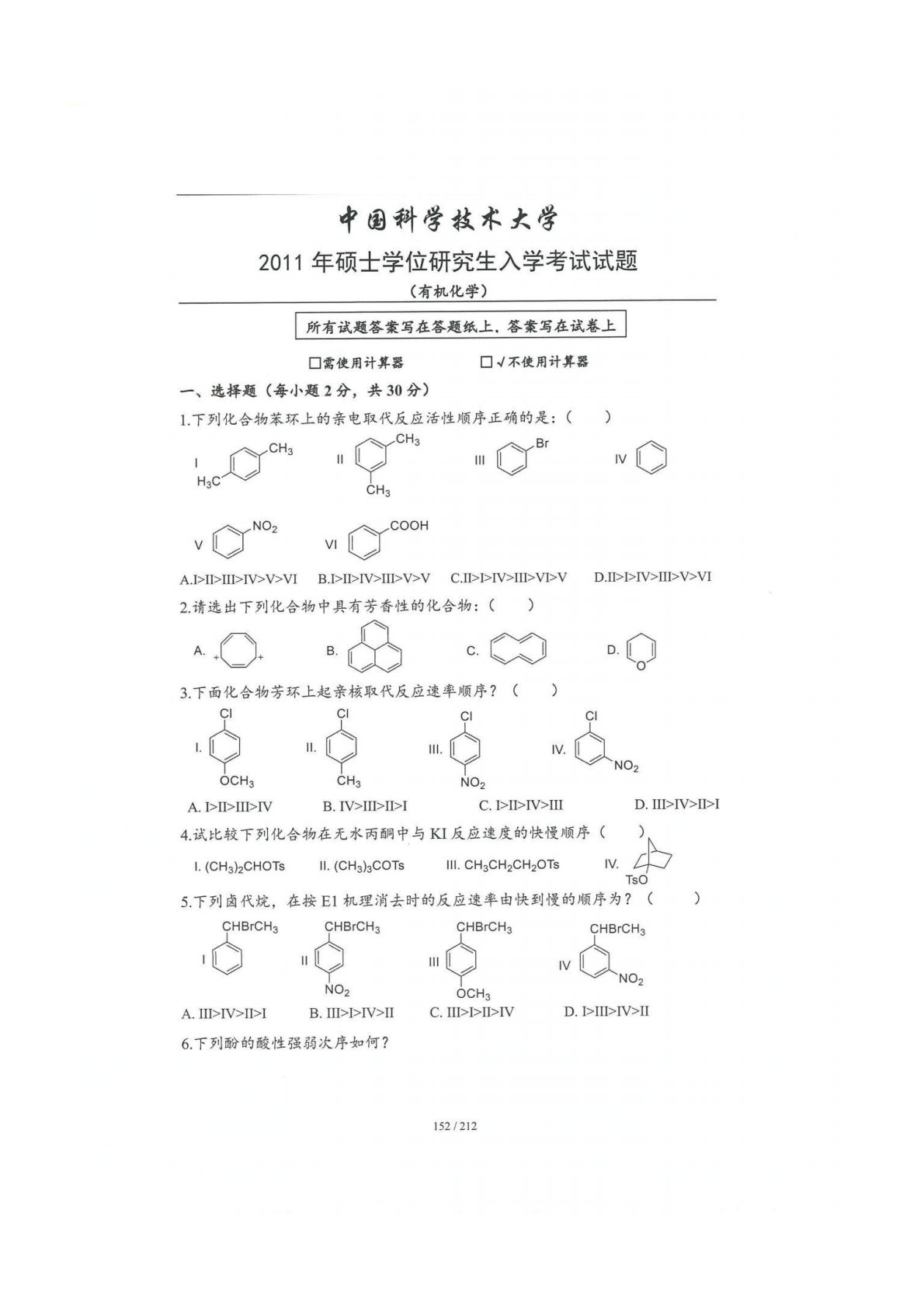 中国科学技术大学854有机化学2011年真题