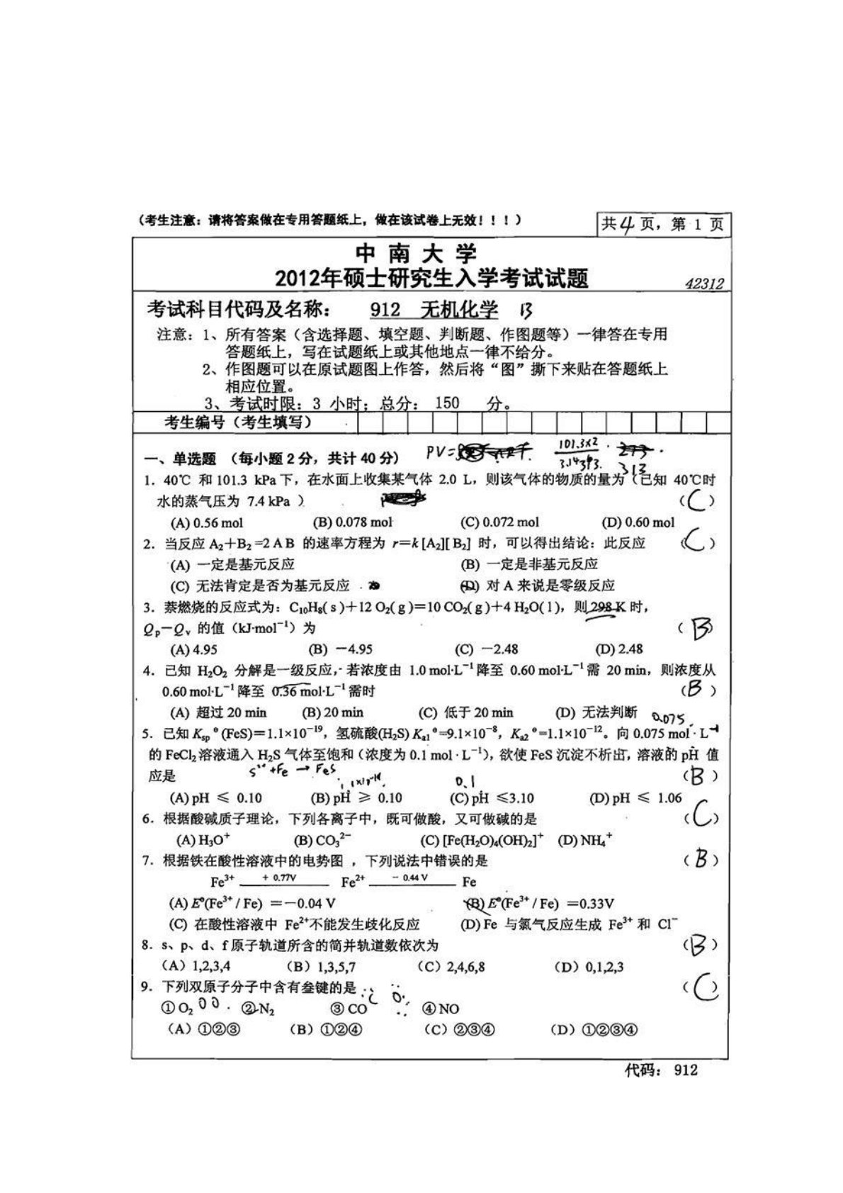 中南大学912无机化学2012年真题