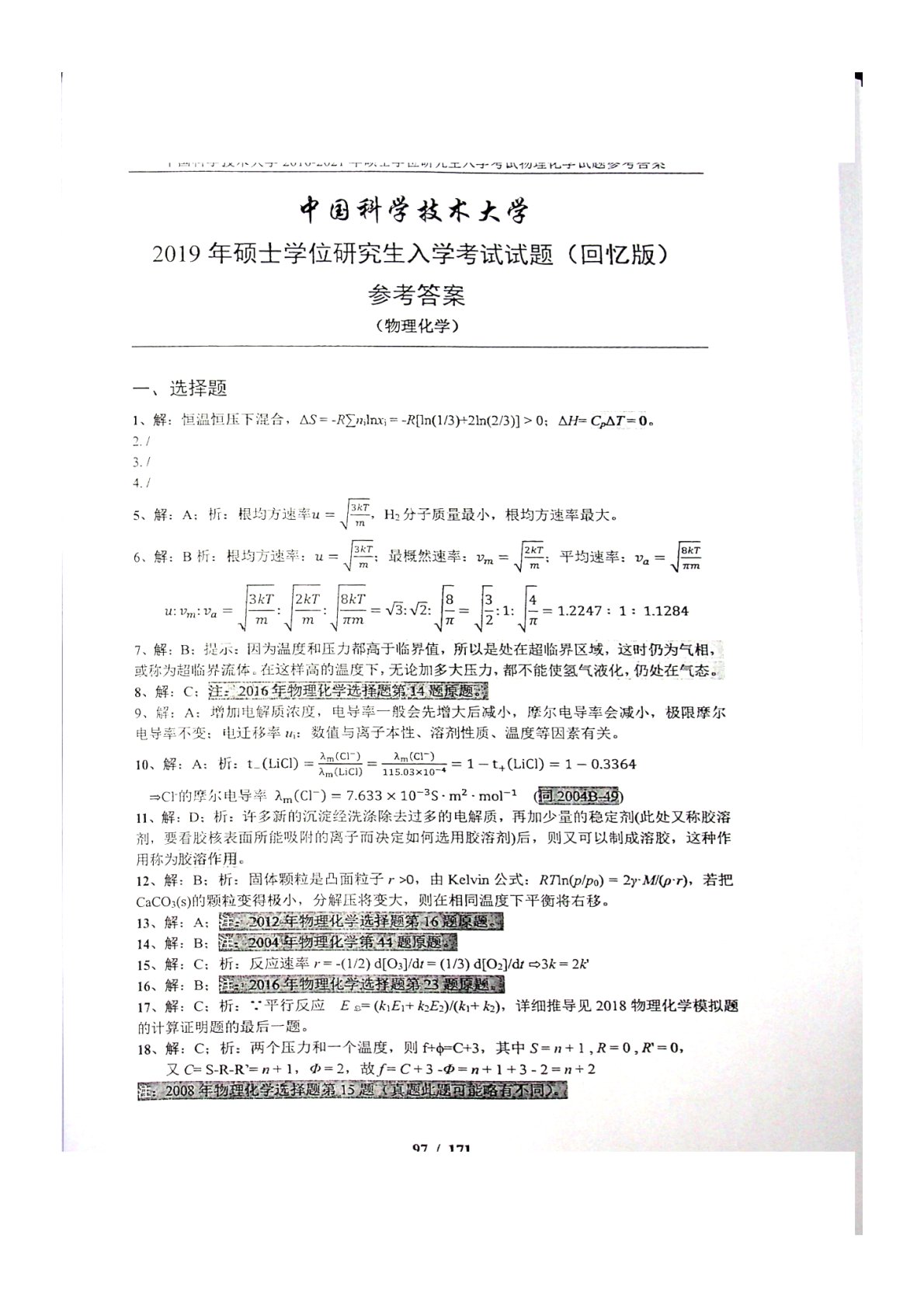 中国科学技术大学621物理化学2019年真题回忆版答案