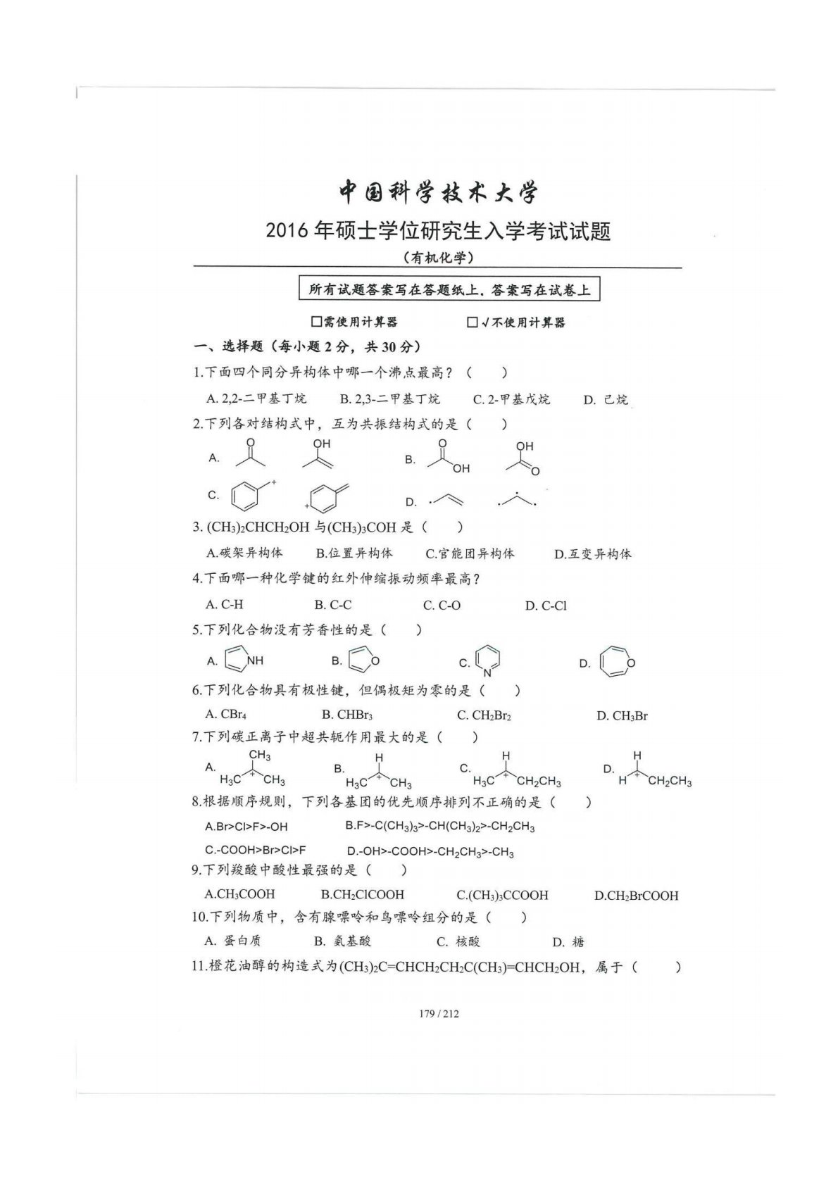中国科学技术大学854有机化学2016年真题