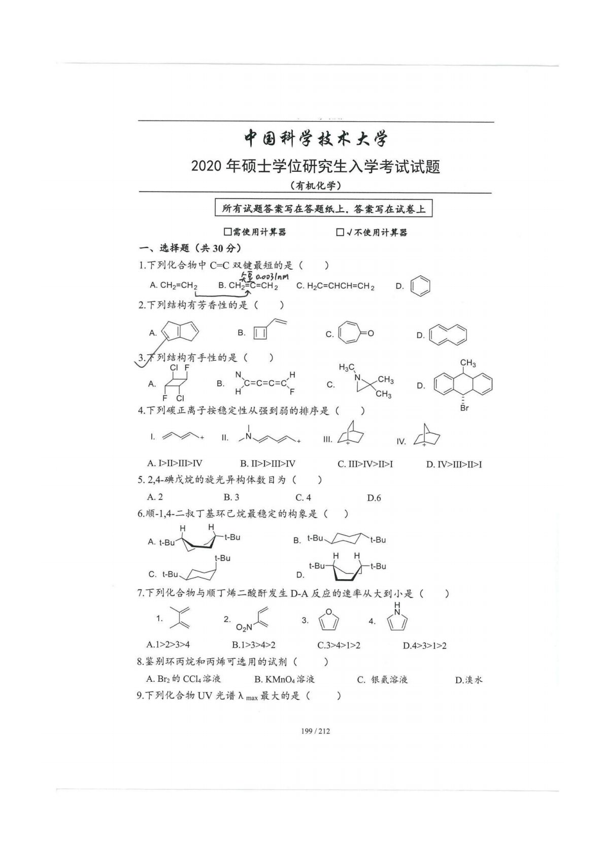 中国科学技术大学854有机化学2020年真题