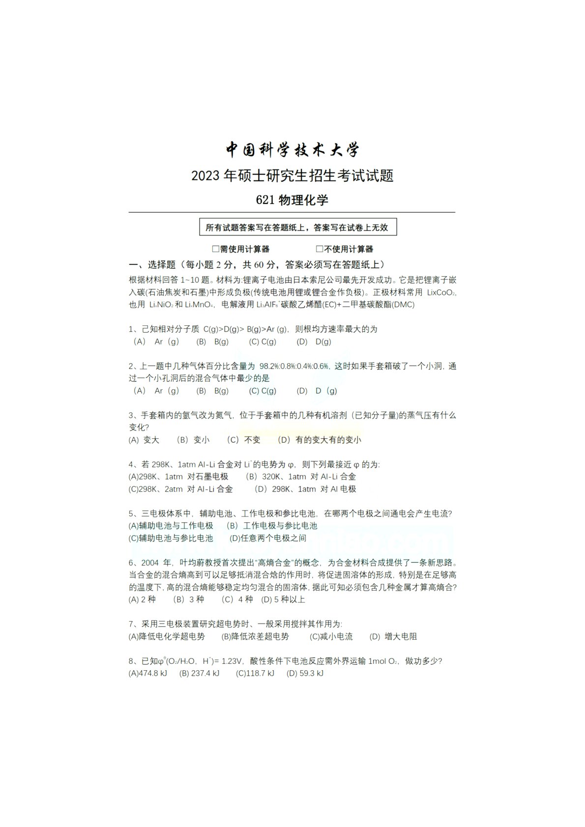 中国科学技术大学621物理化学2023年真题