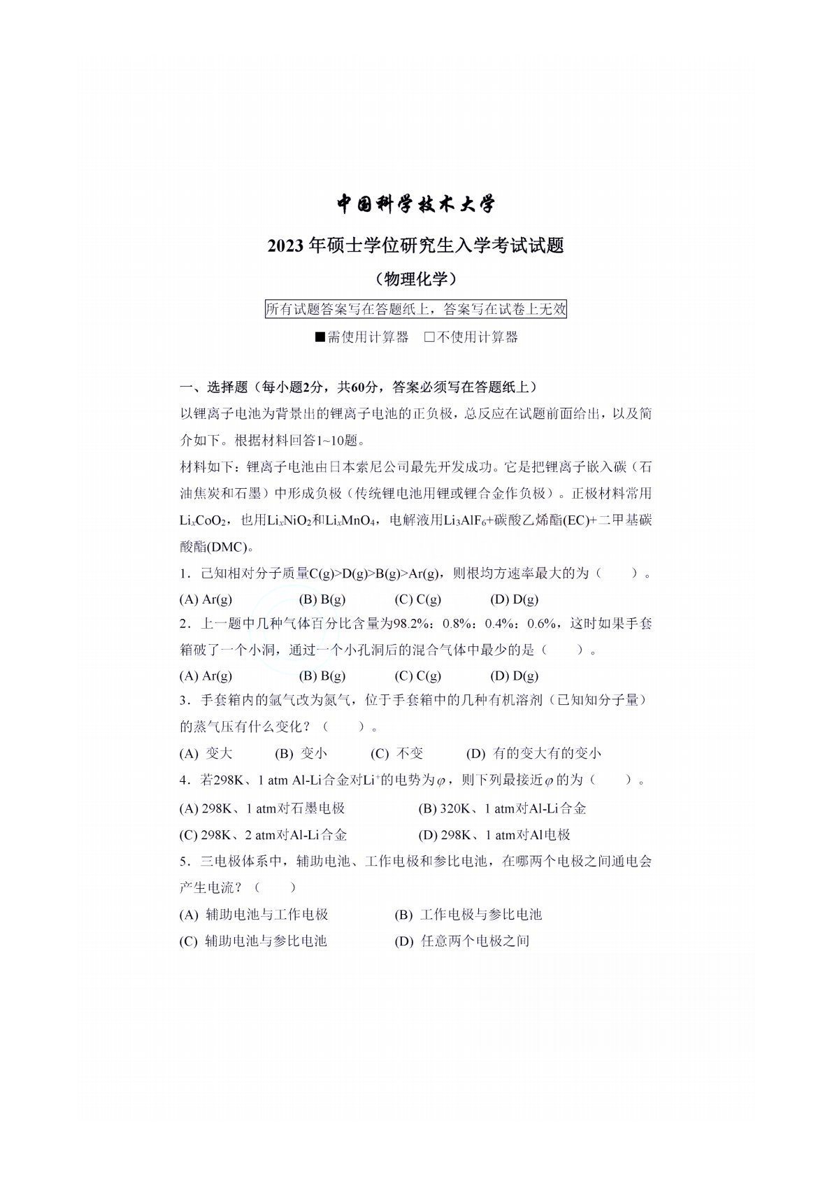 中国科学技术大学621物理化学2023年真题1