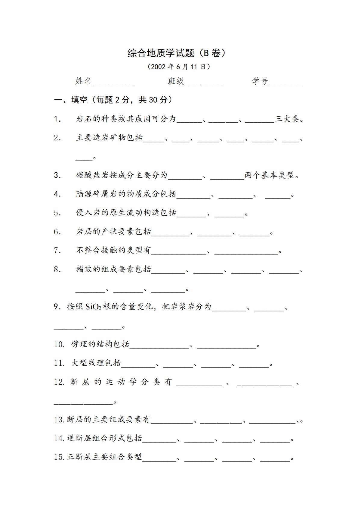 综合地质学试题(B卷)(2002年6月11日)姓名__________班级_________学号________一、填空(每题2分,共30分)1.岩石的种类按其成因可分为______、_______、_______三大类。2.主要造岩矿物包括_____、____、_____、____、_____、____、____。3.碳酸盐岩按成分主要分为________、________两个基本类型。4.陆源碎屑岩的物质成分包括________、________、______。5.侵入岩的原生流动构造包括_______、_______。6.岩层的产状要素包括_________、________、_____...