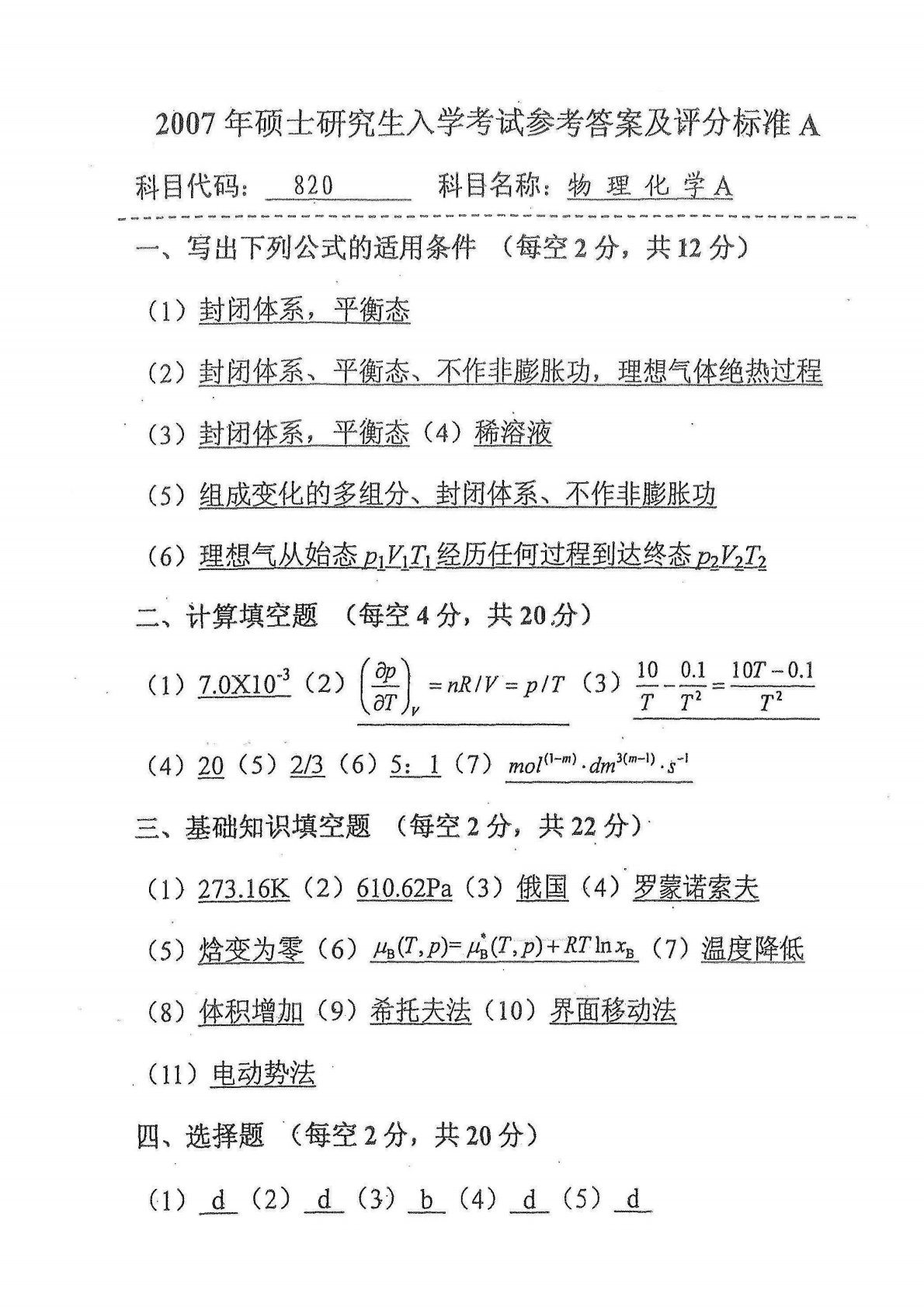 中国海洋大学815物理化学A2007年真题答案