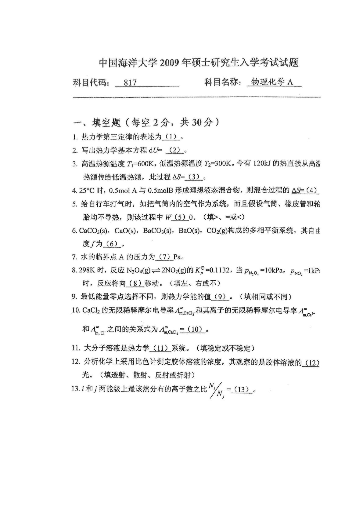 中国海洋大学815物理化学A2009年真题
