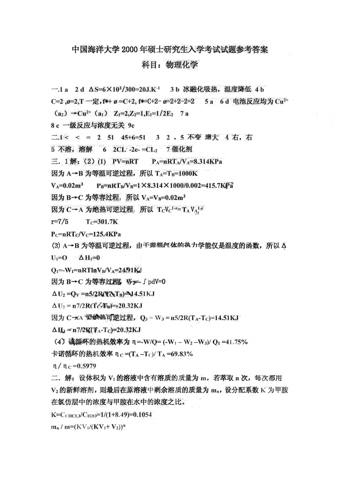 中国海洋大学F0302物理化学2000年真题答案
