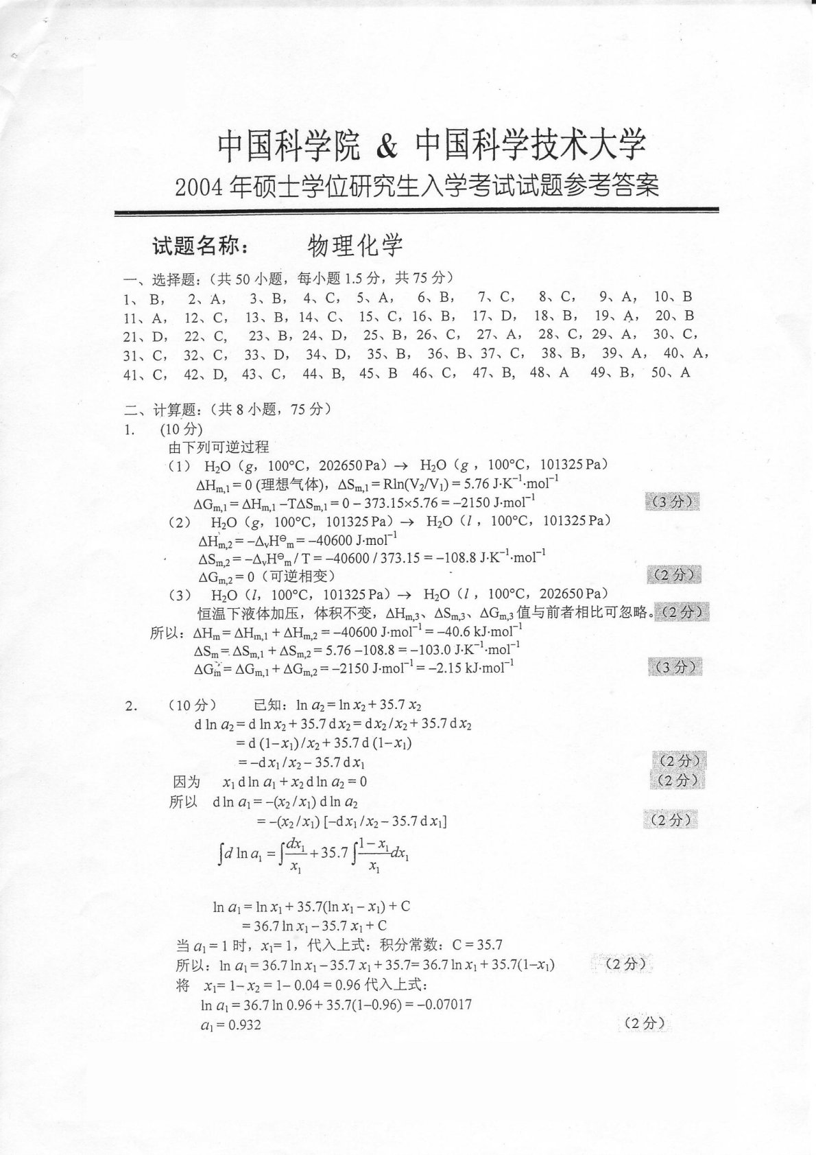 中国科学技术大学621物理化学2004年真题答案