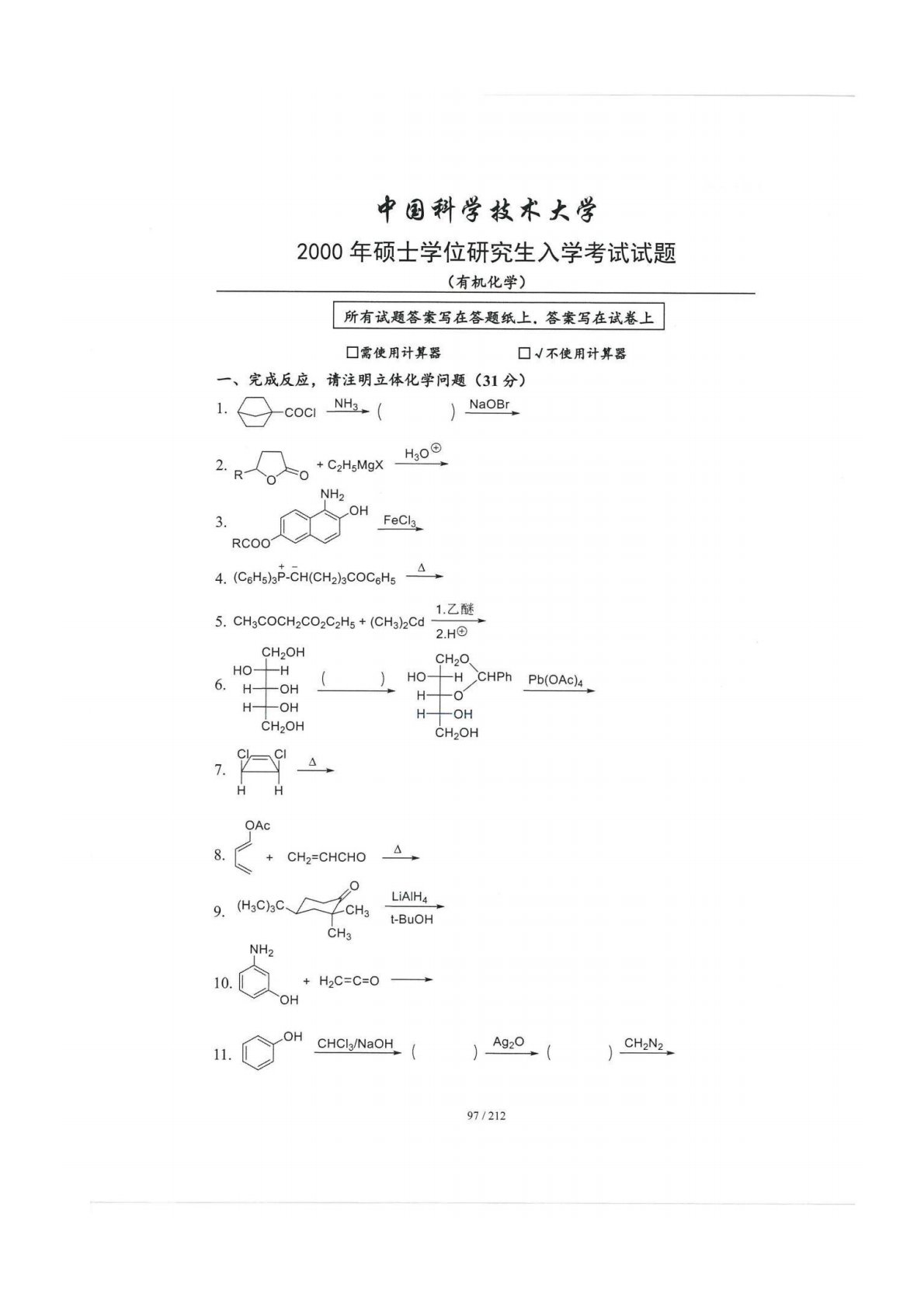 中国科学技术大学854有机化学2000年真题