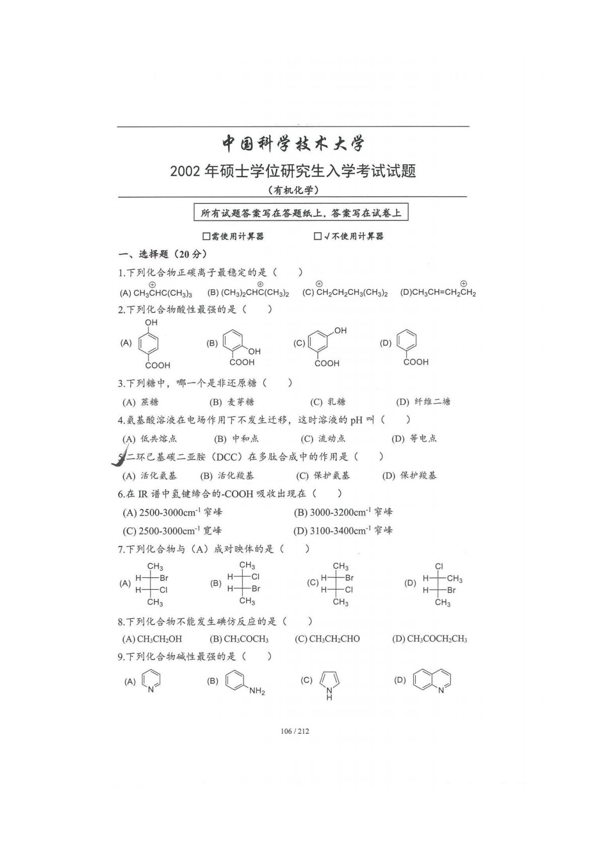 中国科学技术大学854有机化学2002年真题