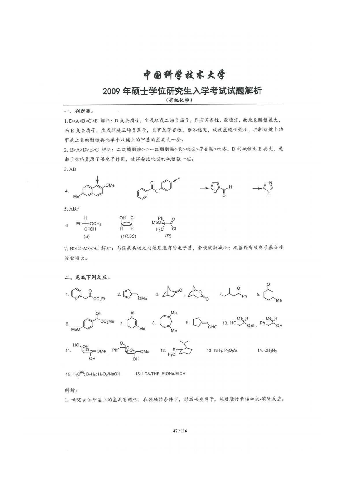 中国科学技术大学854有机化学2009年真题答案