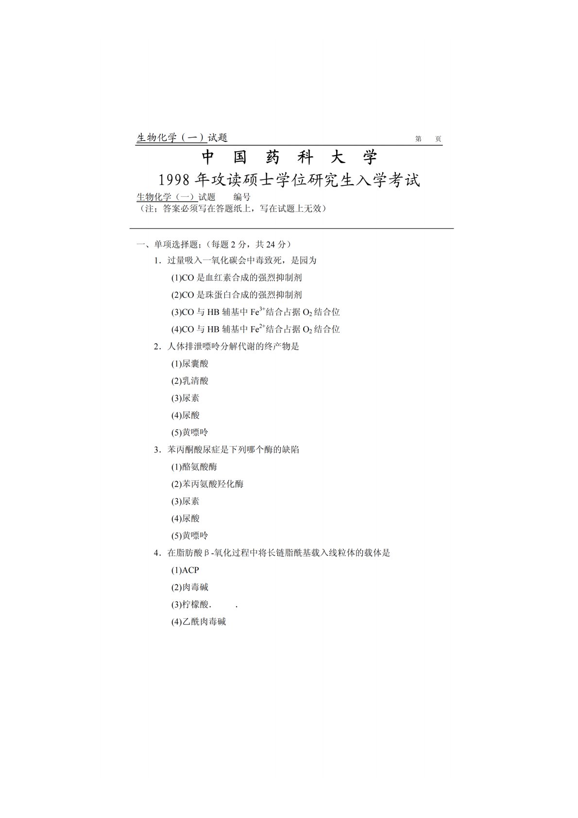 中国药科大学338生物化学1998年真题