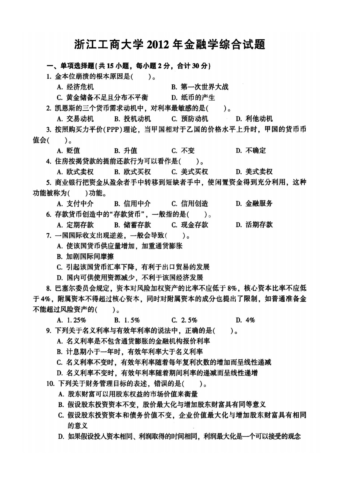 浙江工商大学431金融学综合2012年真题