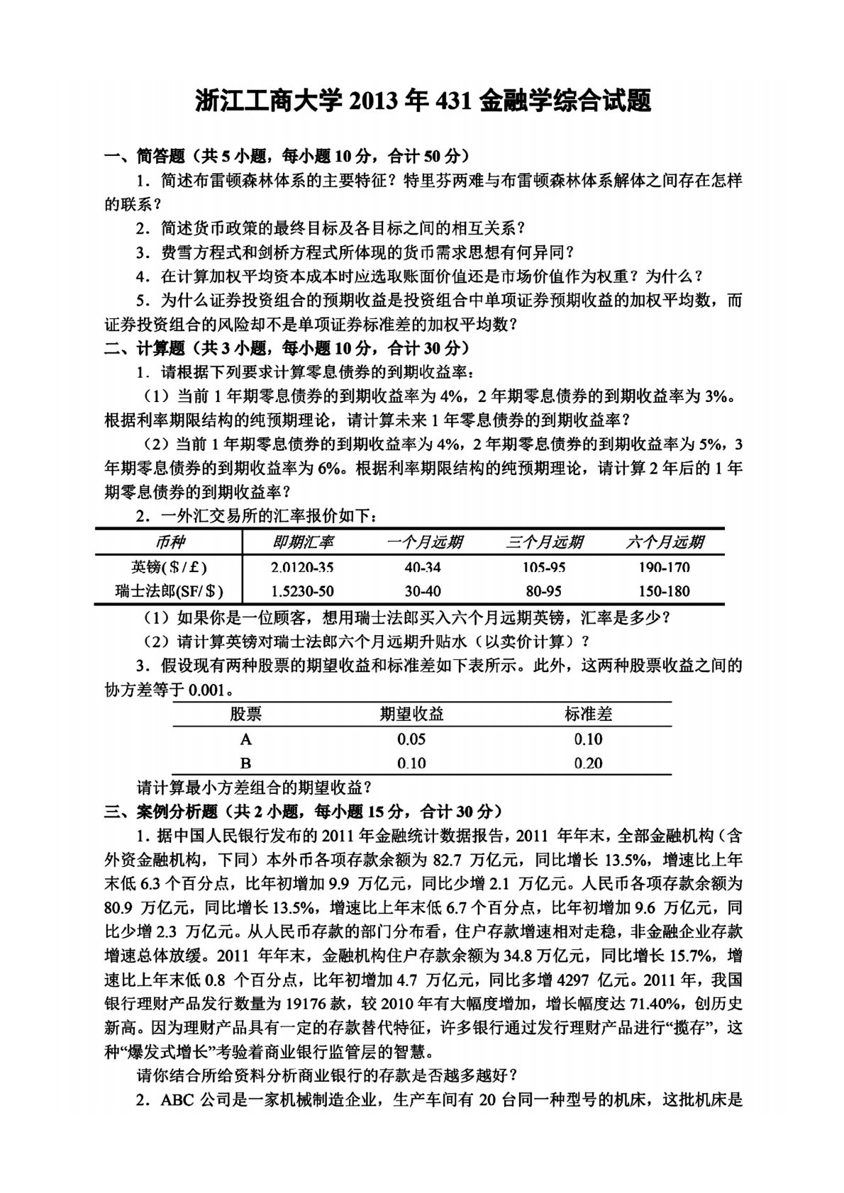 浙江工商大学431金融学综合2013年真题