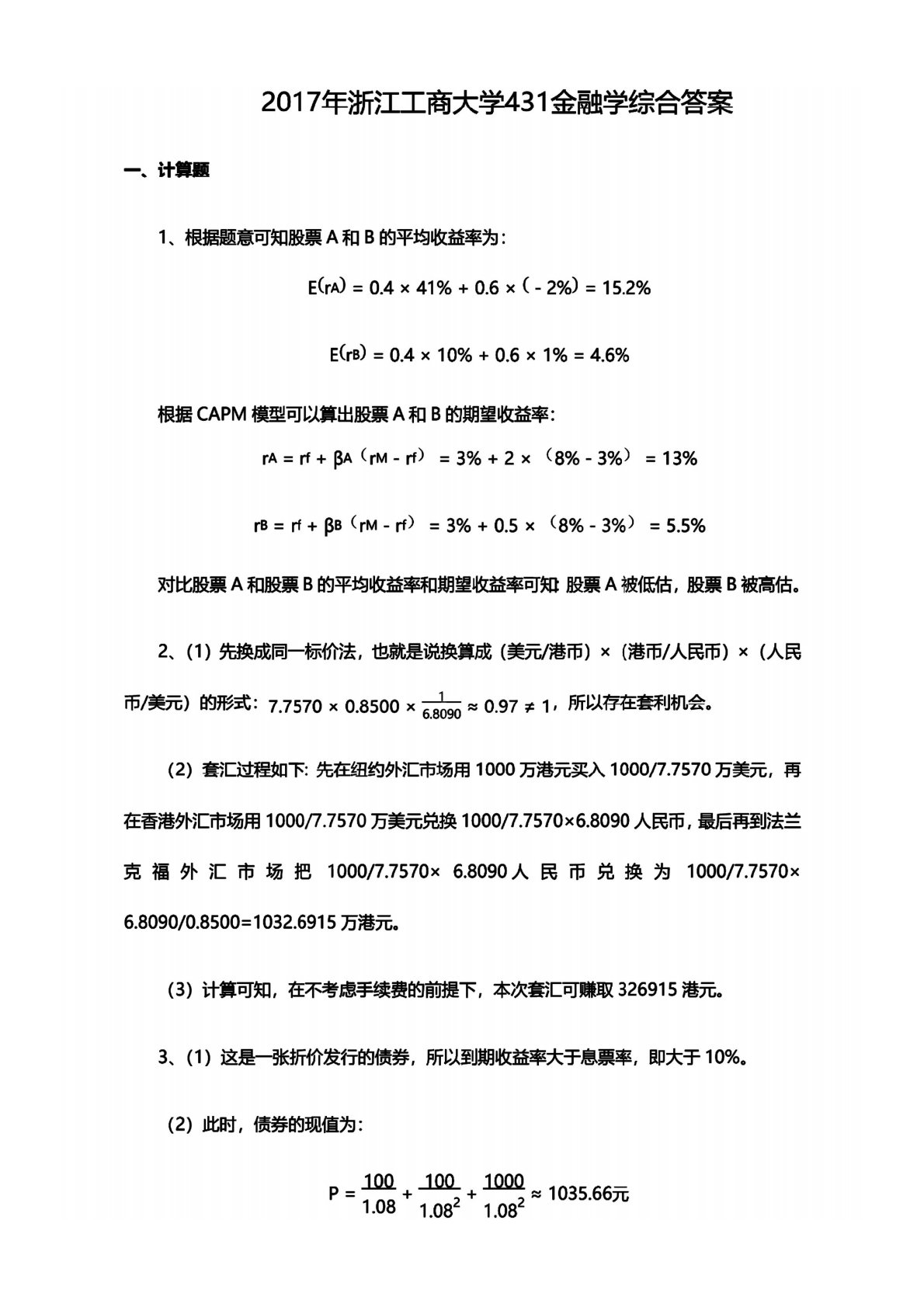 浙江工商大学2017年431金融学综合试题解析
