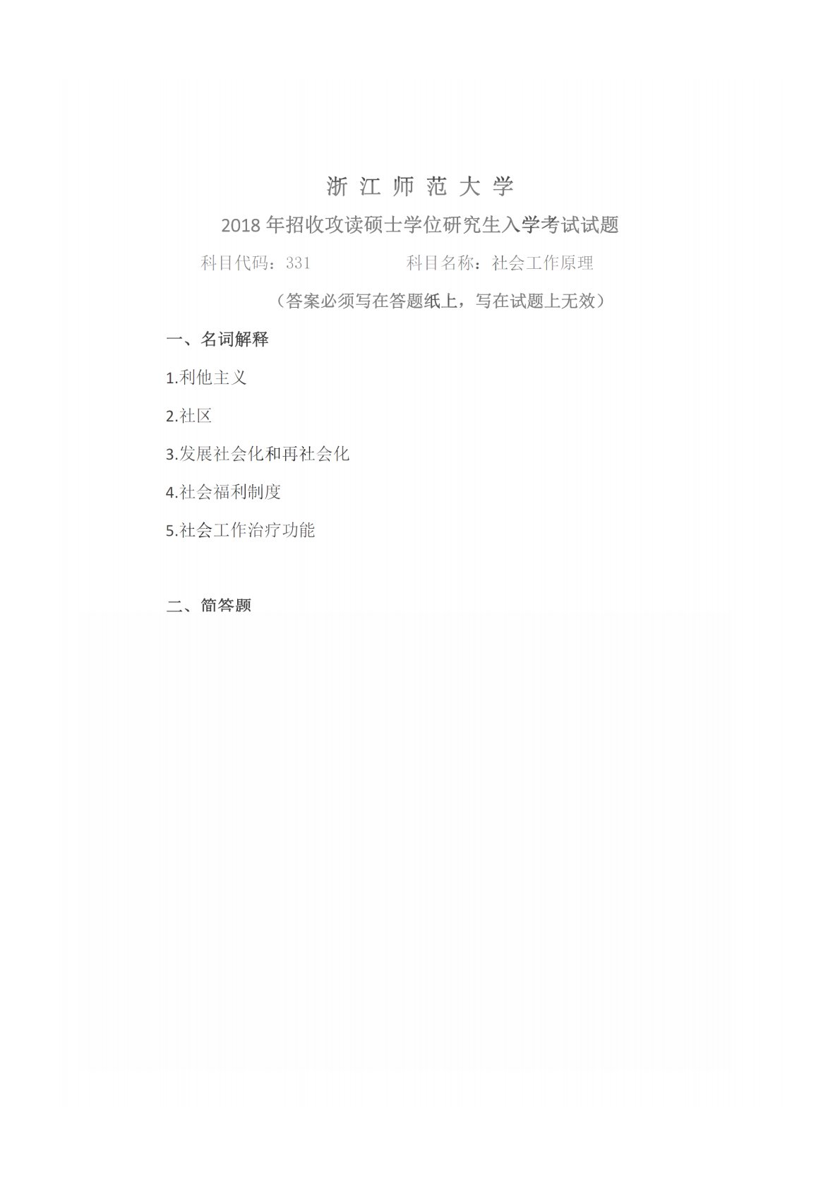 浙江师范大学331社会工作原理(专硕)2018年真题
