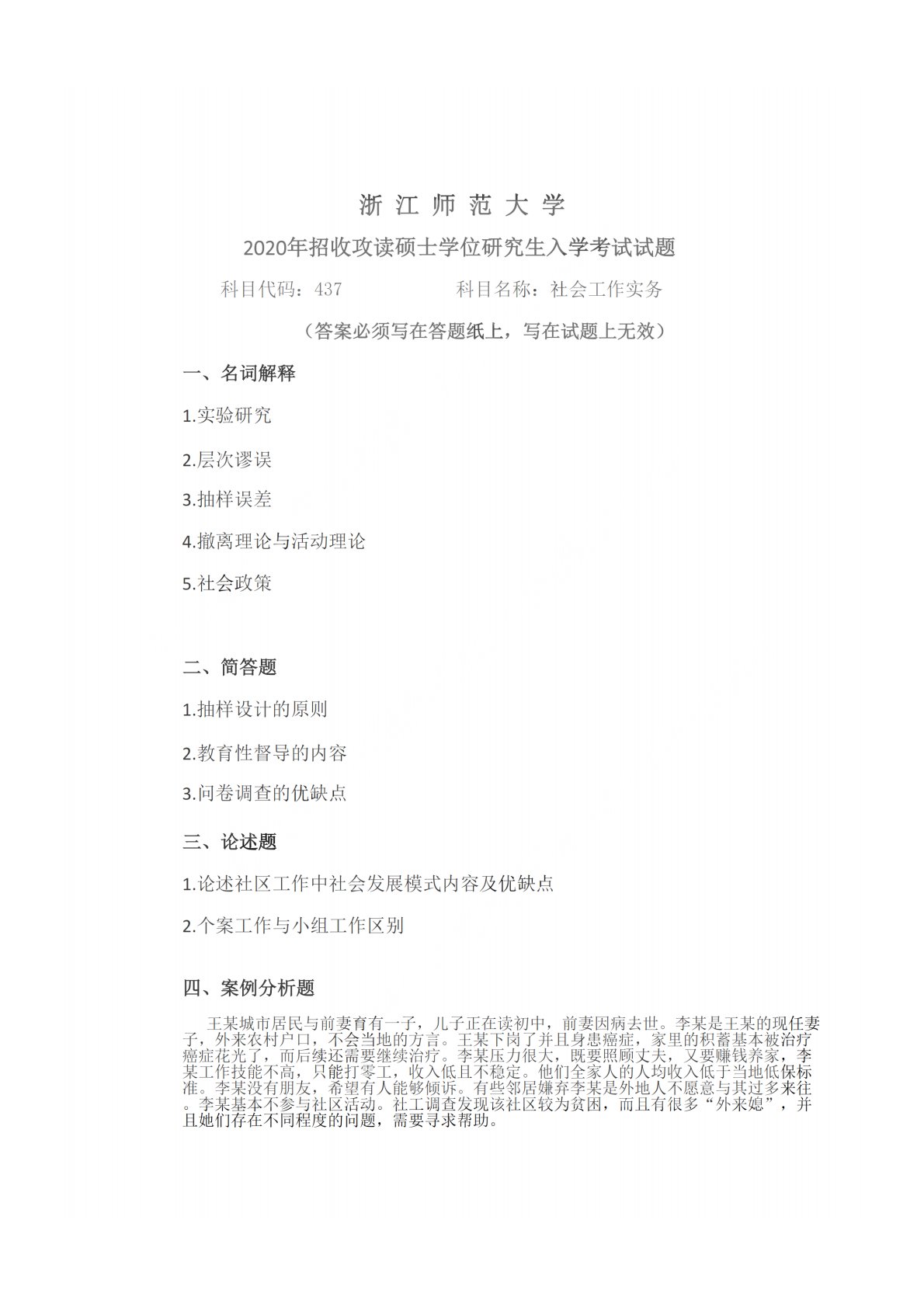 浙江师范大学437社会工作实务(专硕)2020年真题