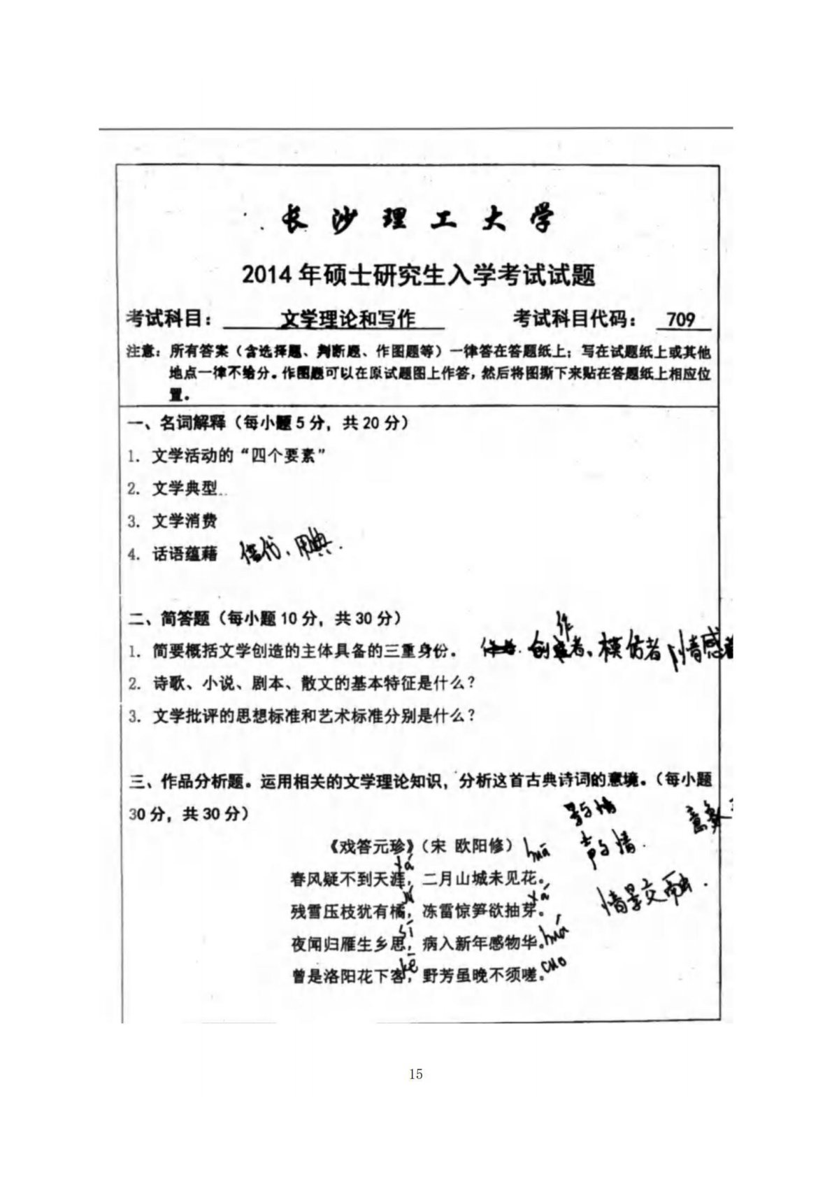 长沙理工大学709文学批评与写作2014年真题
