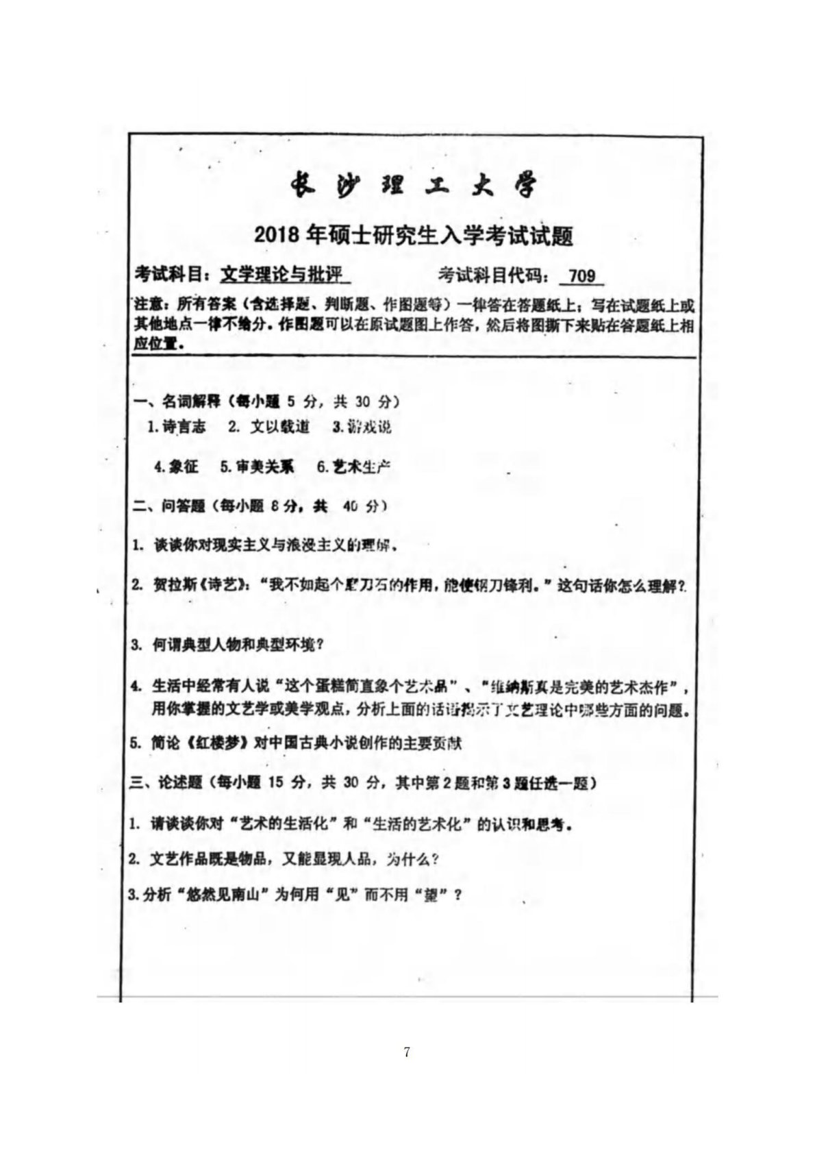 长沙理工大学709文学批评与写作2018年真题