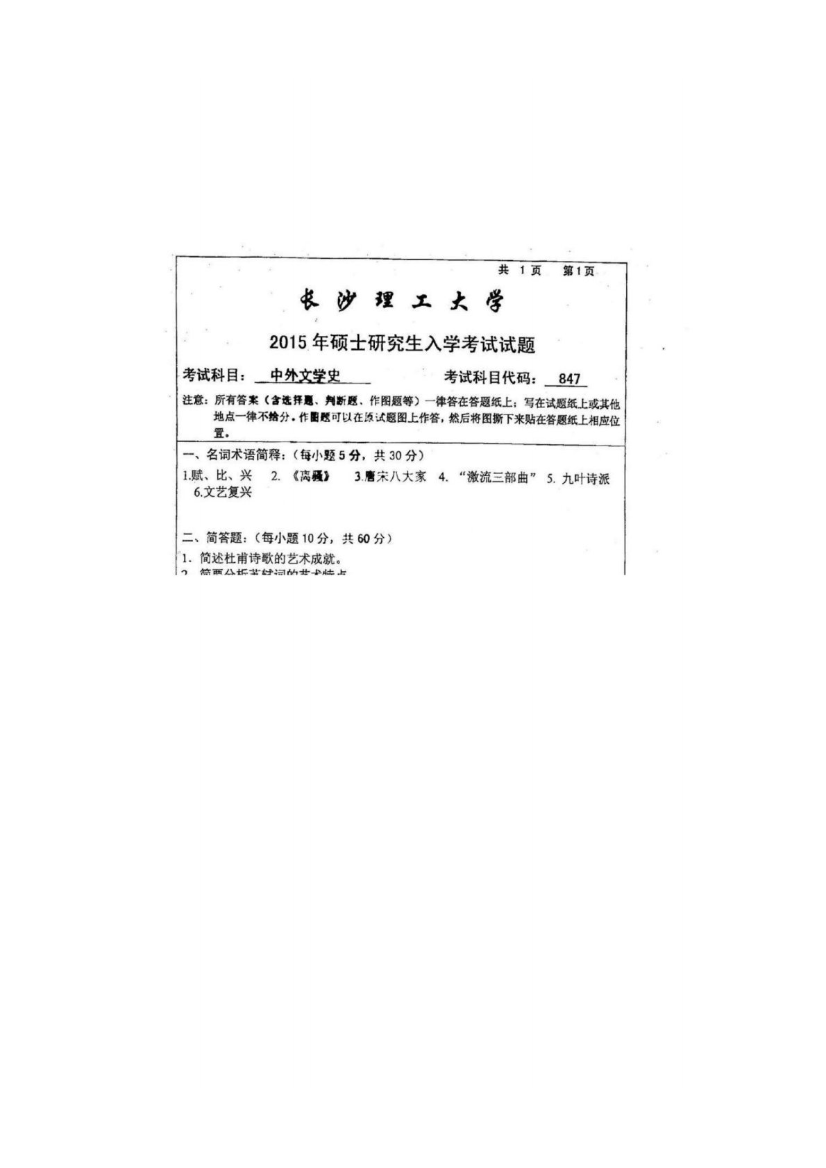 长沙理工大学807文学综合2015年真题