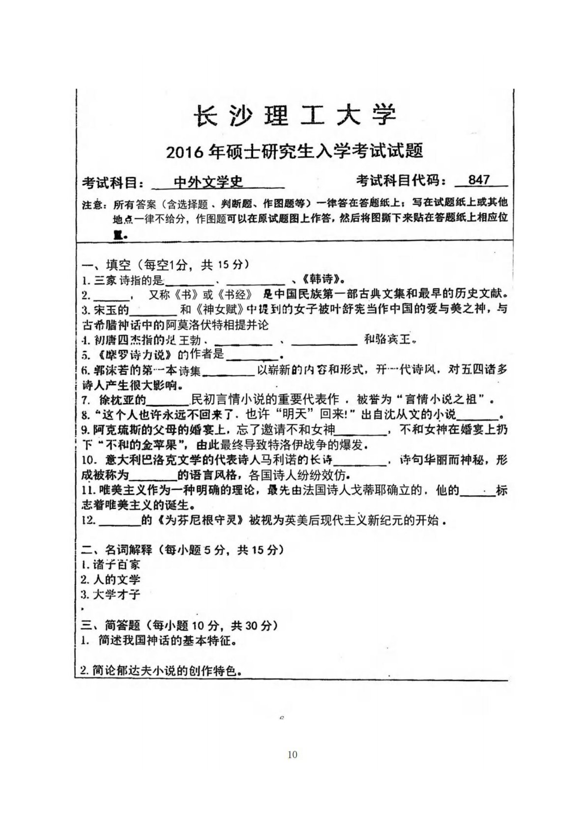 长沙理工大学807文学综合2016年真题