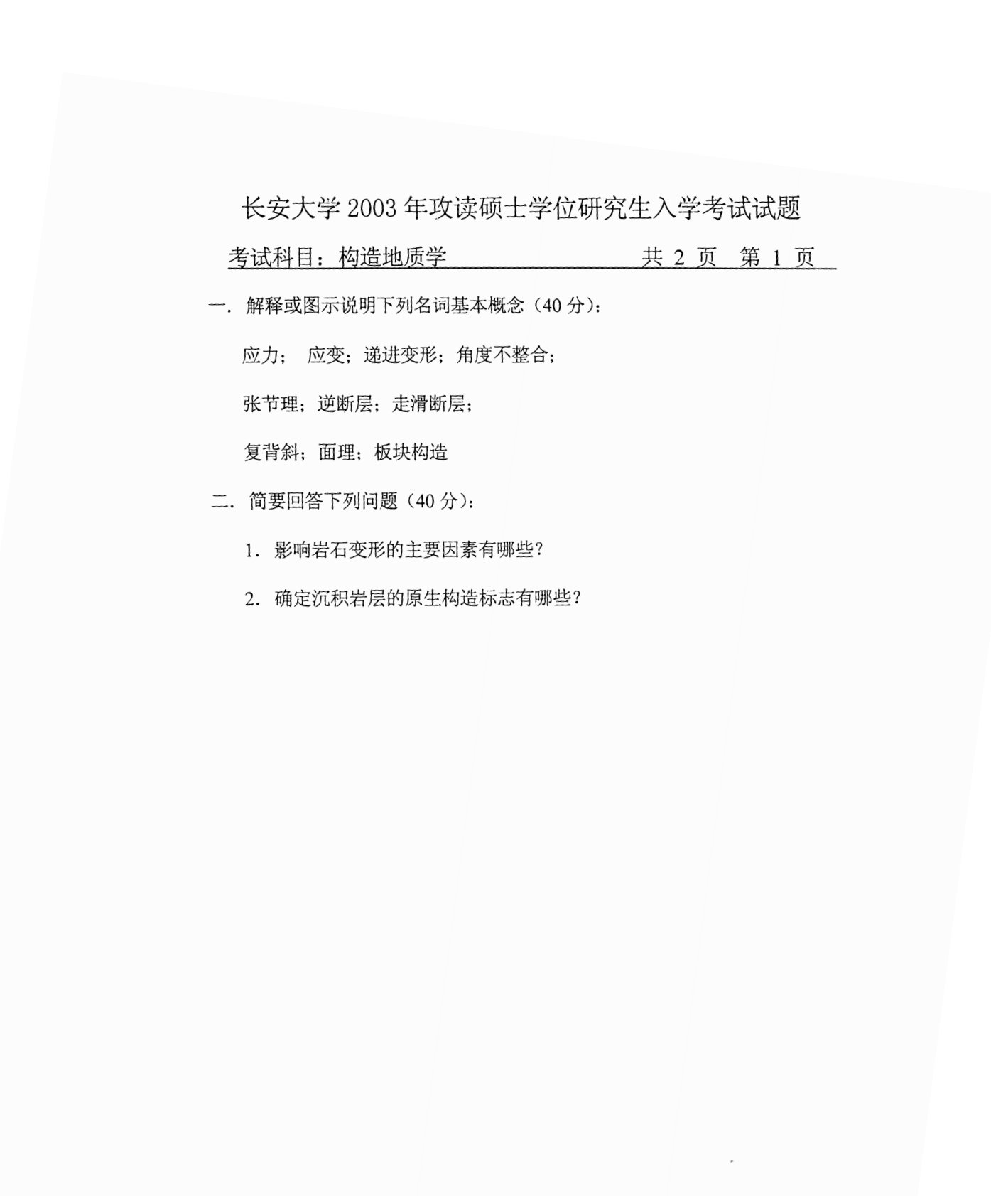 长安大学614构造地质学2003年真题