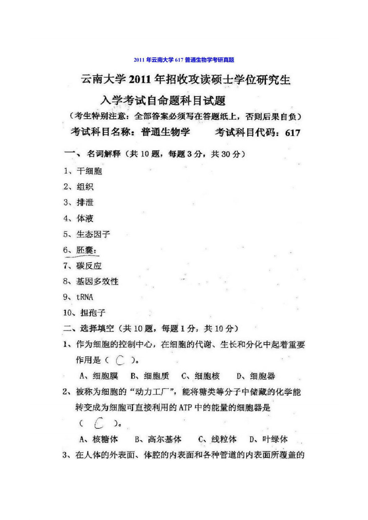 云南大学617普通生物学2011年真题