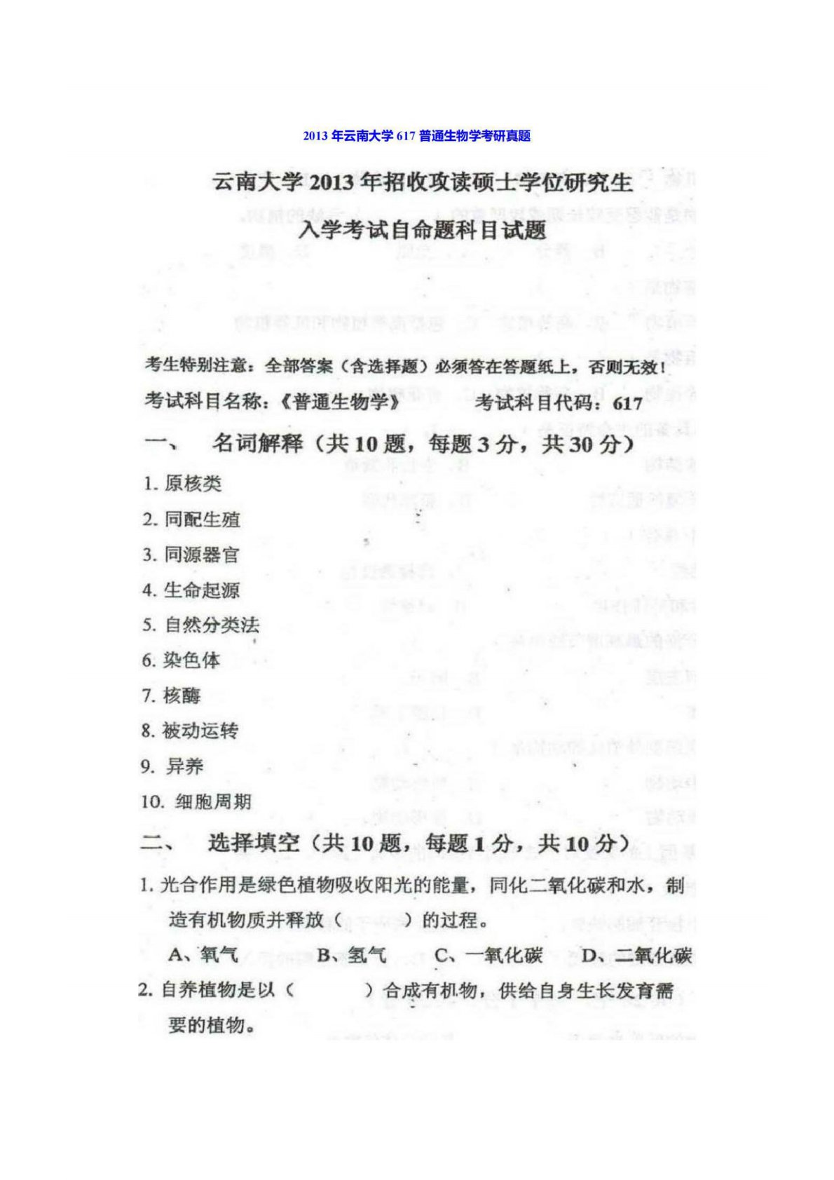 云南大学617普通生物学2013年真题