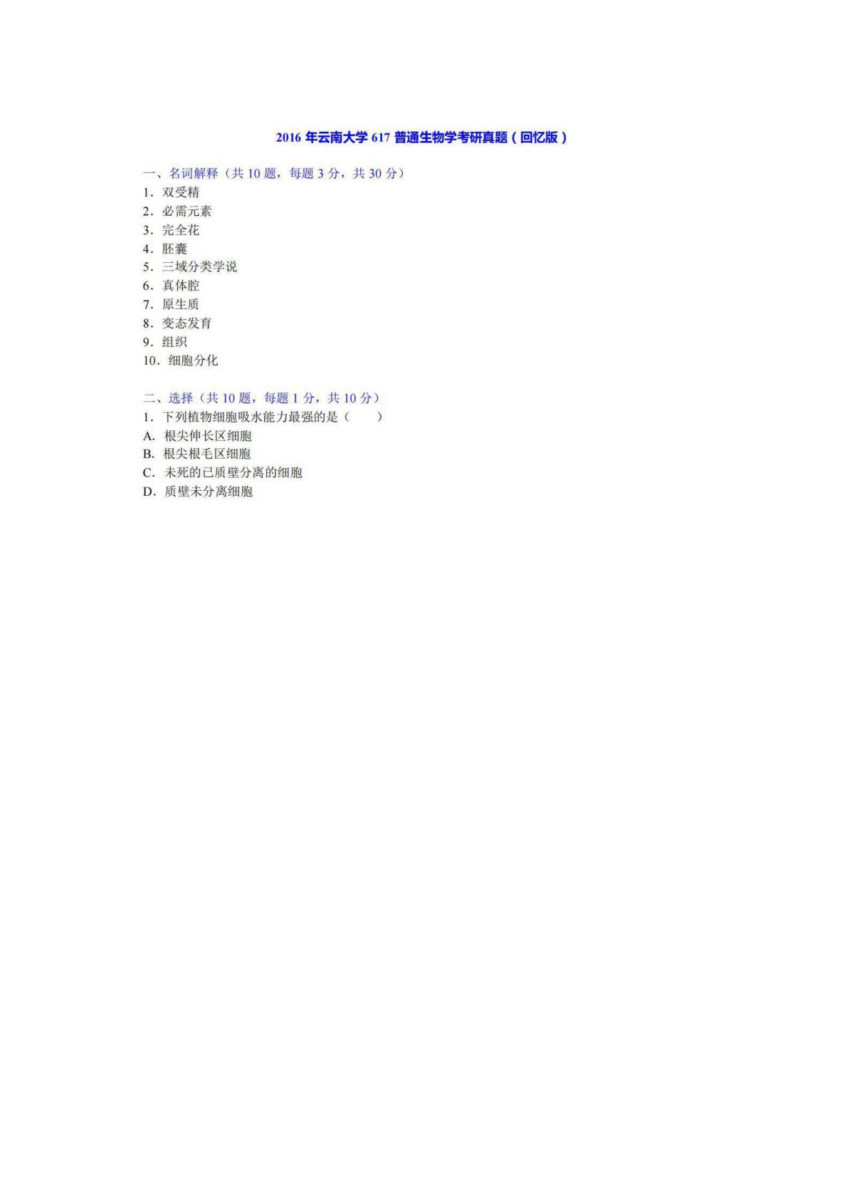云南大学617普通生物学2016年真题