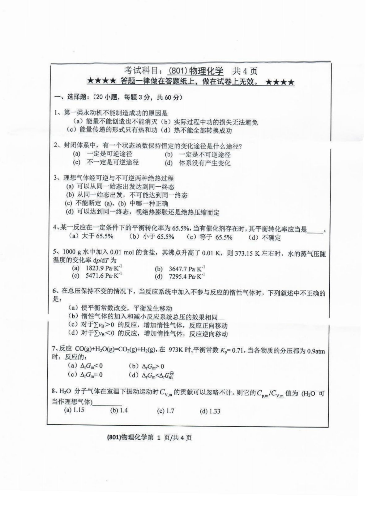 浙江工业大学801物理化学2019年真题