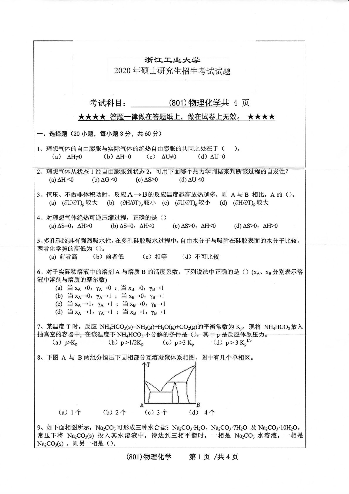 浙江工业大学801物理化学2020年真题