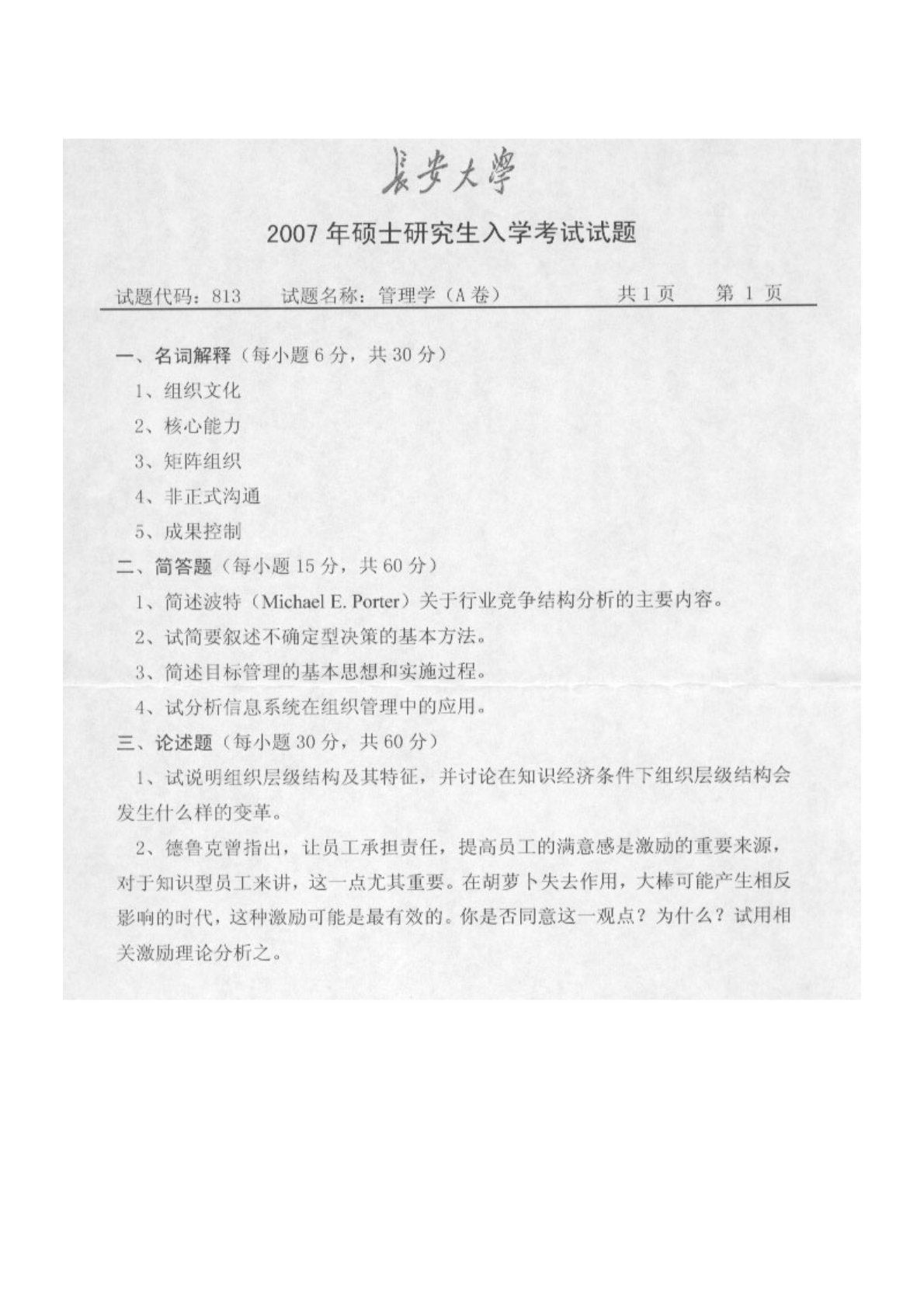 长安大学805管理学2007年真题