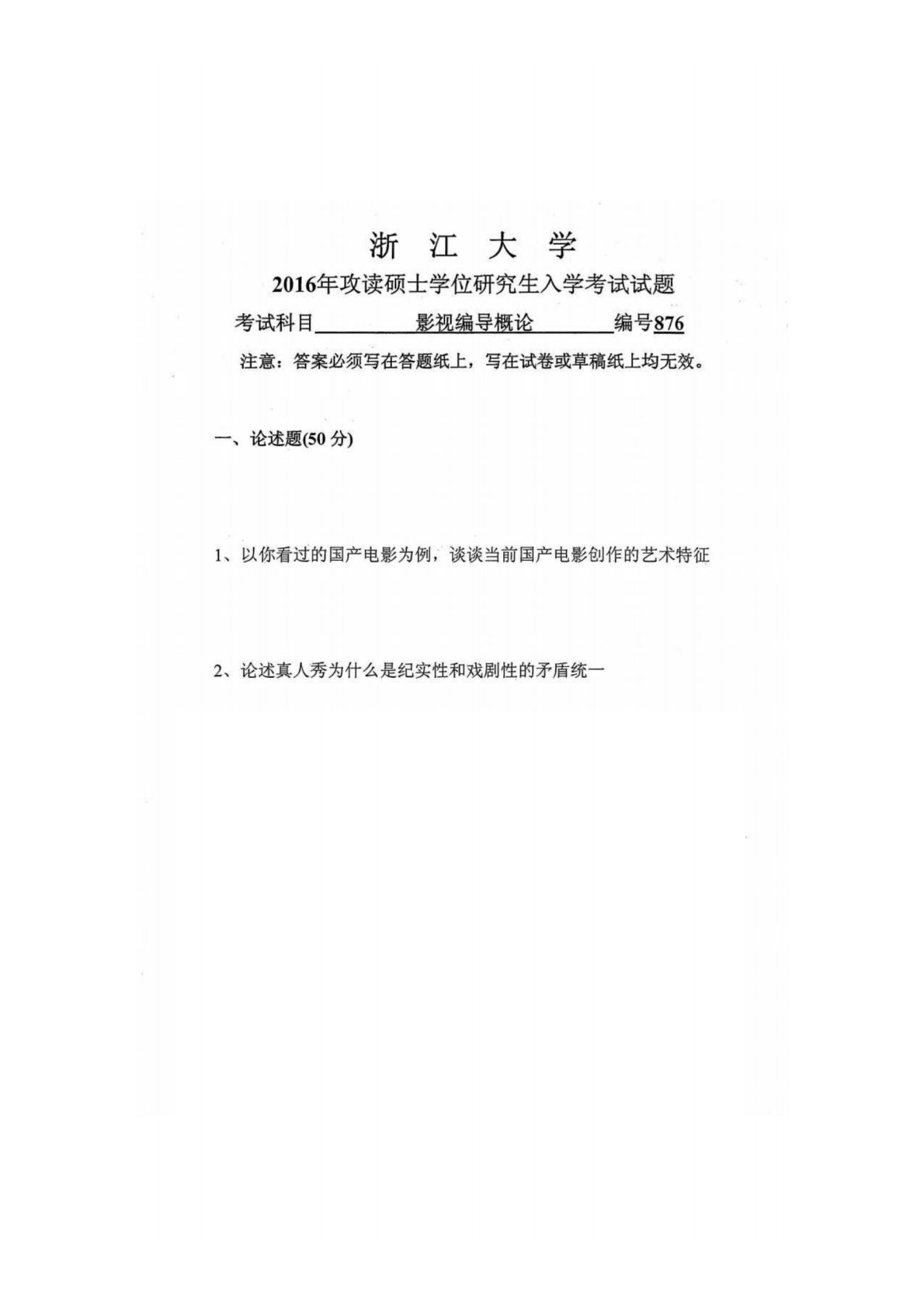 浙江大学876影视编导概论2016年真题