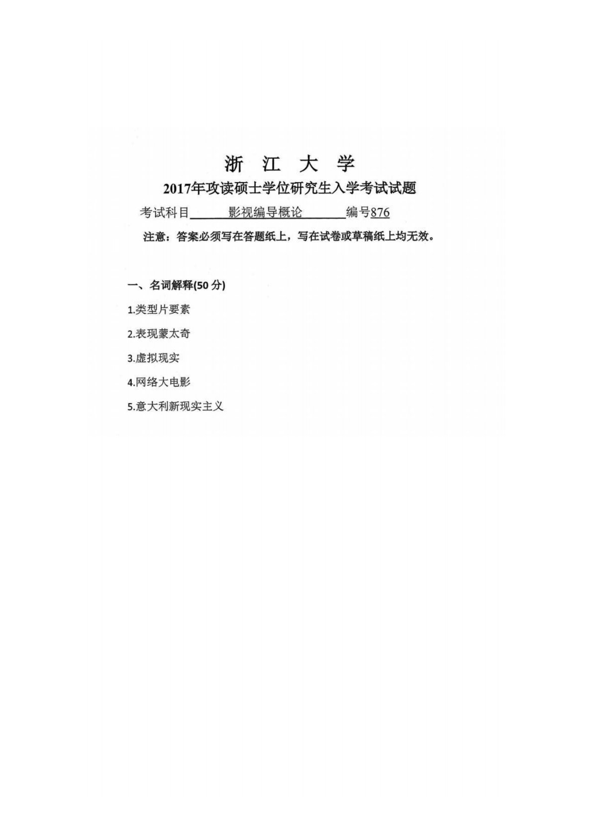 浙江大学876影视编导概论2017年真题