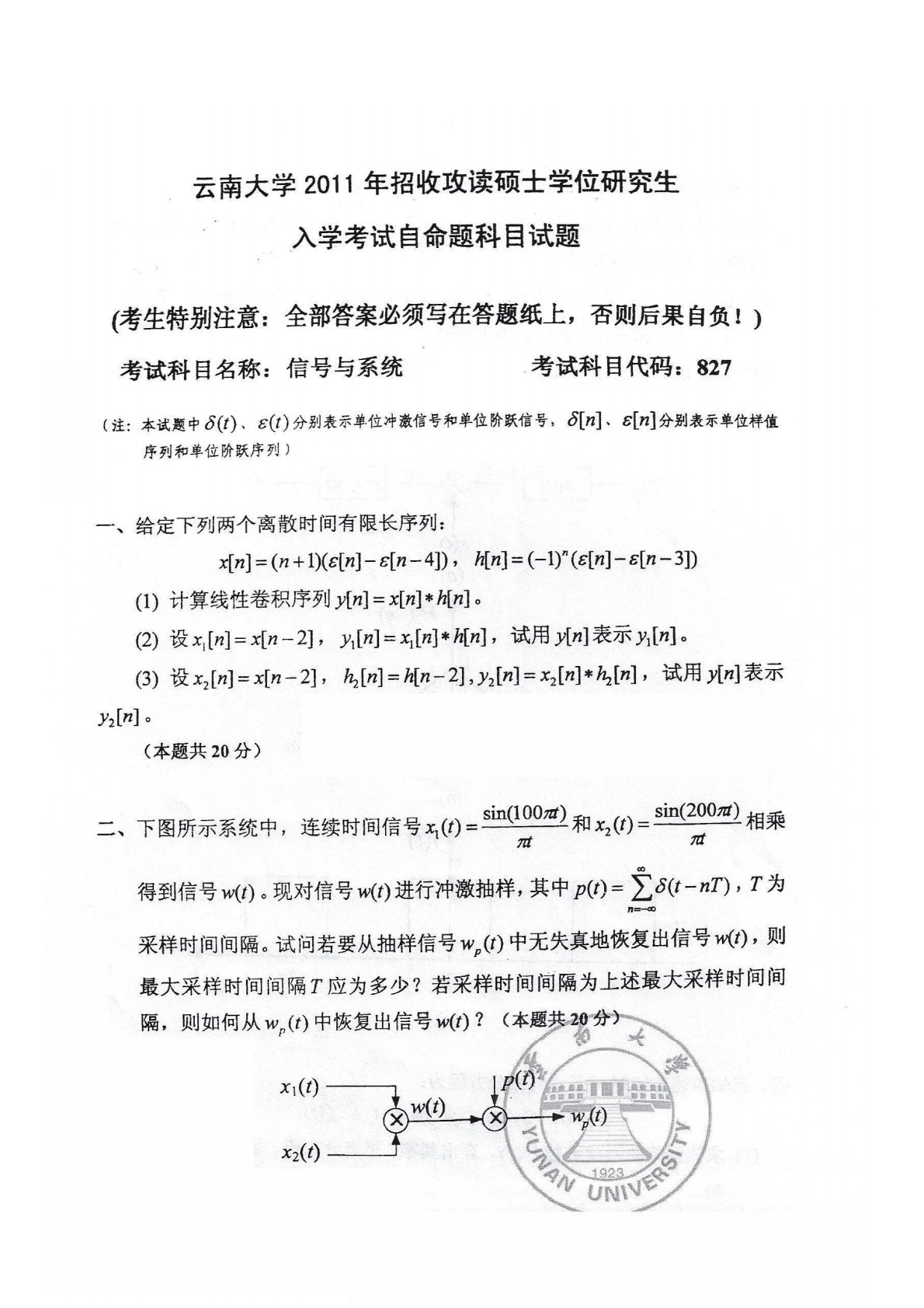 云南大学847专业基础综合2011年真题