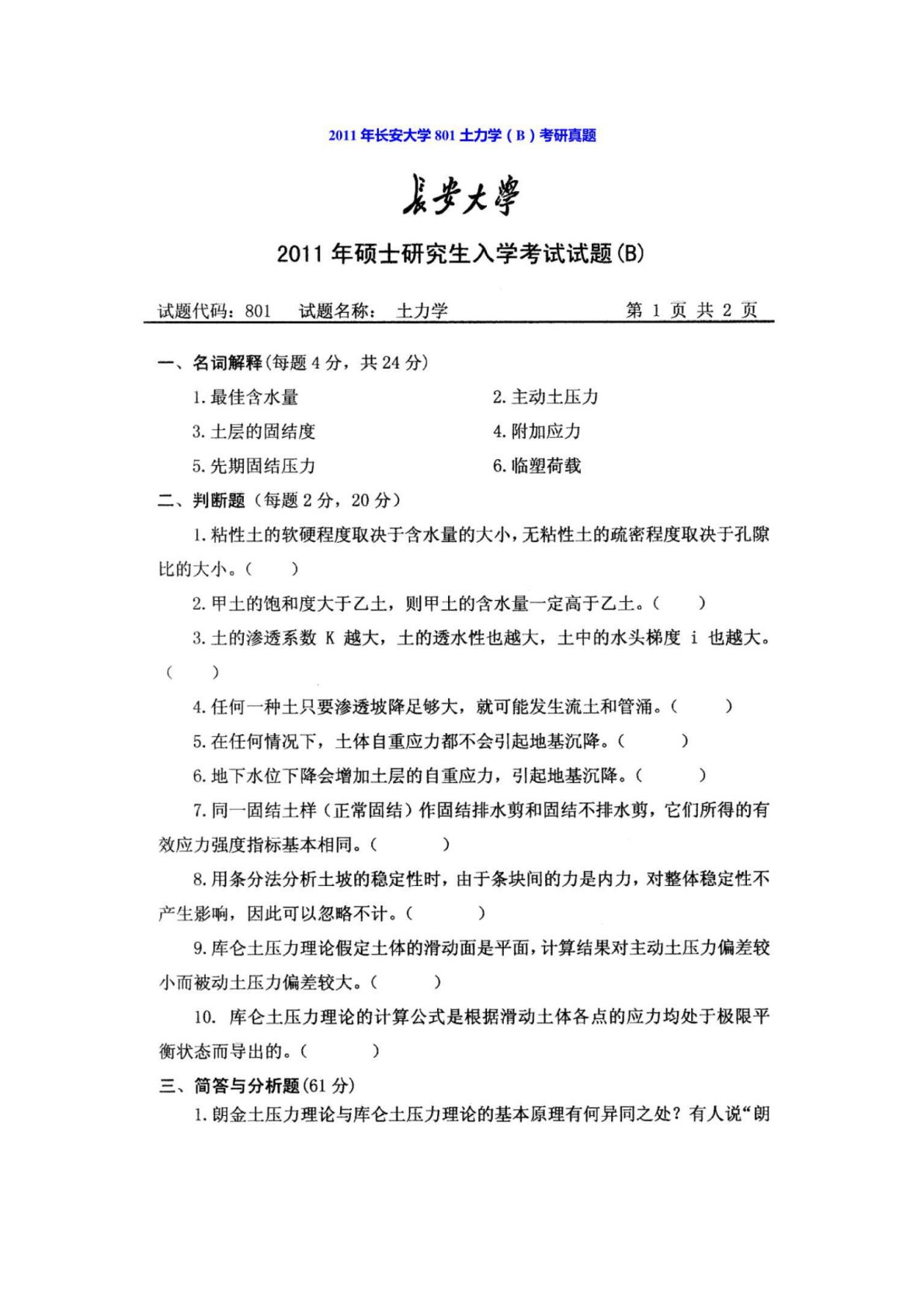 长安大学801土力学2011年真题B卷