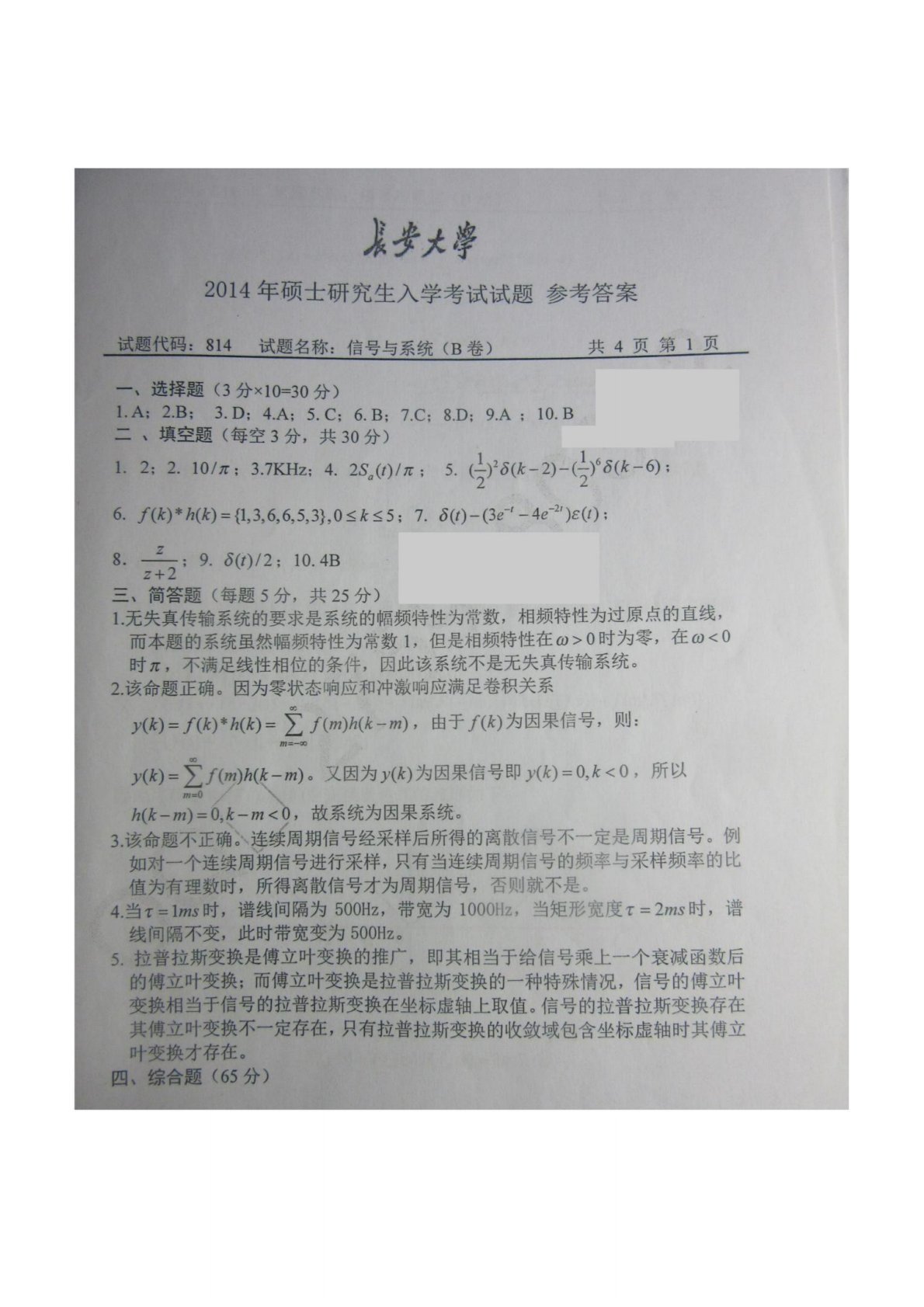 长安大学814信号与系统2014年真题答案B卷