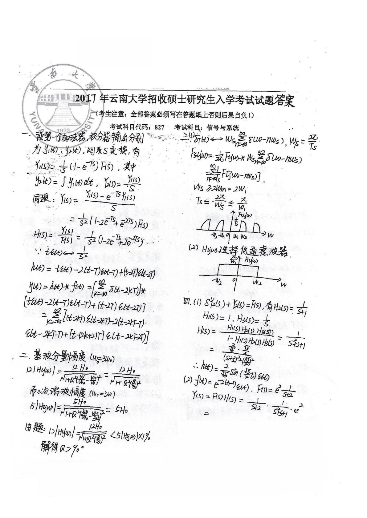 云南大学847专业基础综合2017年真题答案手写版