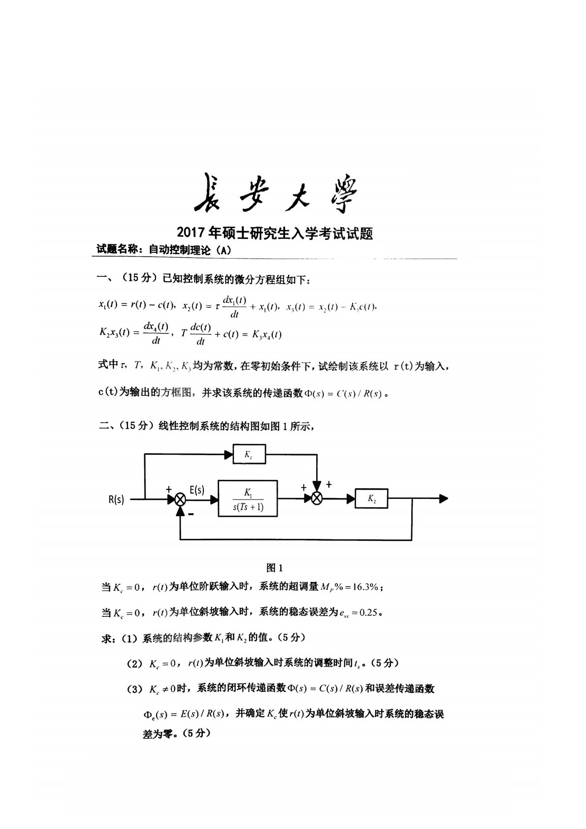 长安大学812自动控制理论2017年真题