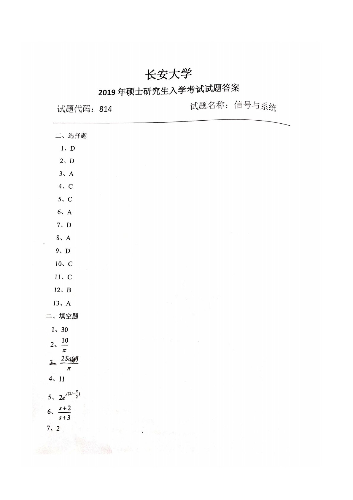 长安大学814信号与系统2019年真题答案
