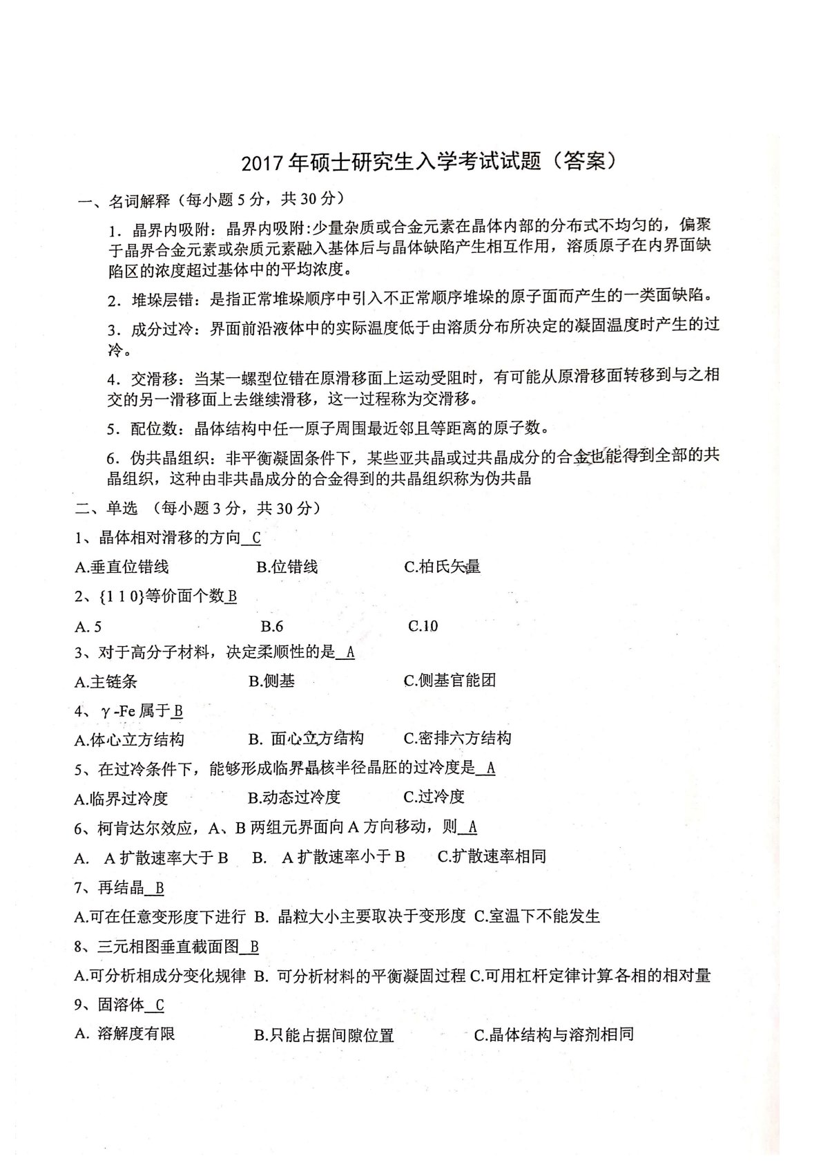 长安大学838材料科学基础2017年真题答案