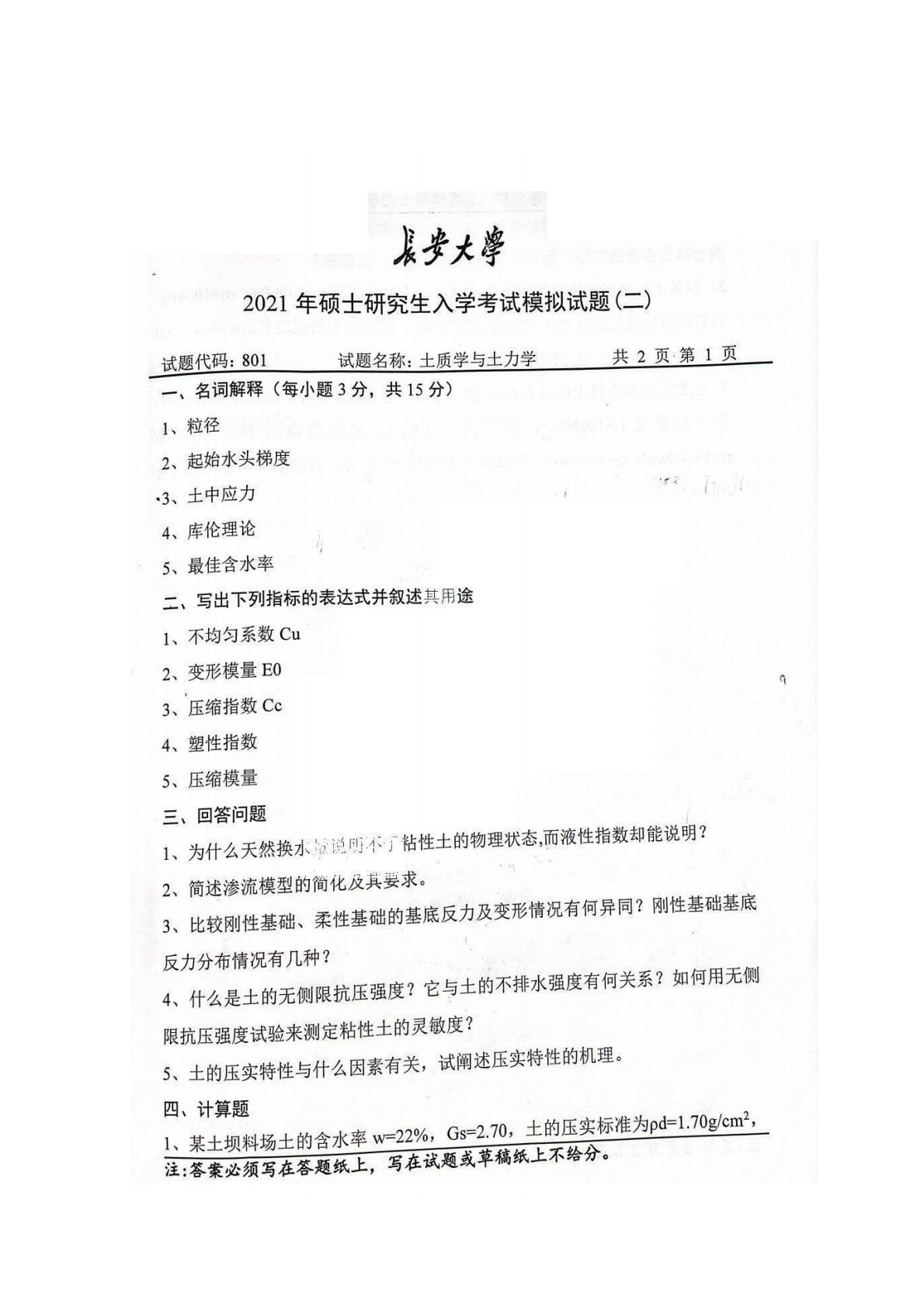 长安大学801土力学2021年模拟试题二