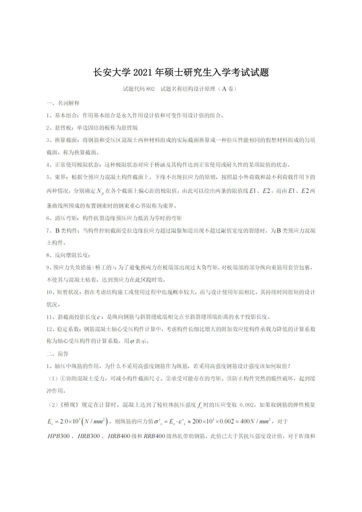 长安大学802结构设计原理2021年真题答案