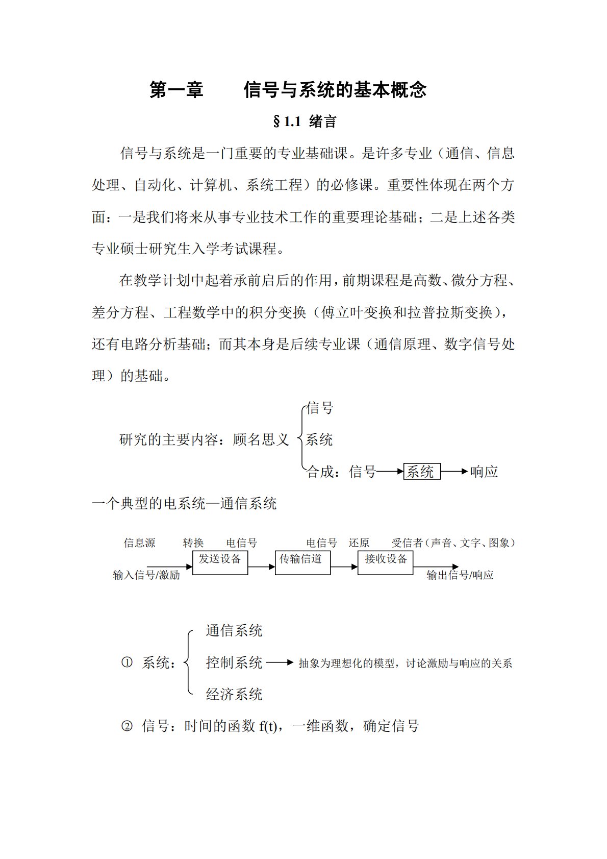 第一章信号与系统的基本概念§1.1绪言信号与系统是一门重要的专业基础课。是许多专业(通信、信息处理、自动化、计算机、系统工程)的必修课。重要性体现在两个方面:一是我们将来从事专业技术工作的重要理论基础;二是上述各类专业硕士研究生入学考试课程。在教学计划中起着承前启后的作用,前期课程是高数、微分方程、差分方程、工程数学中的积分变换(傅立叶变换和拉普拉斯变换),还有电路分析基础;而其本身是后续专业课(通信原理、数字信号处理)的基础。信号研究的主要内容:顾名思义系统合成:信号系统响应一个典型的电系统—通信系统信息源转换电信号电信号还原受信者(声音、文字、图象)发送设备传输信道接收设备输入信号/激励输...