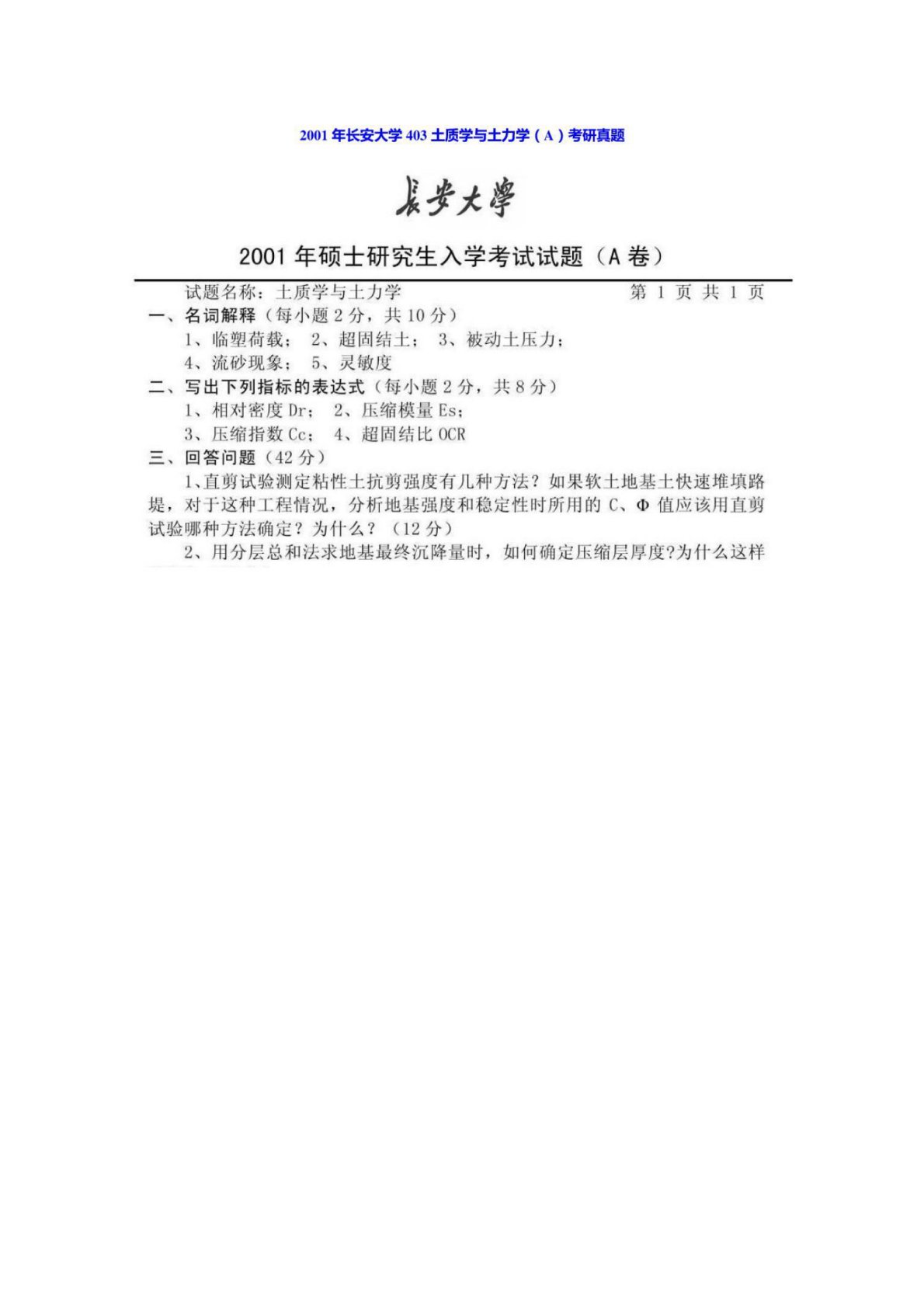 长安大学801土力学2001年真题