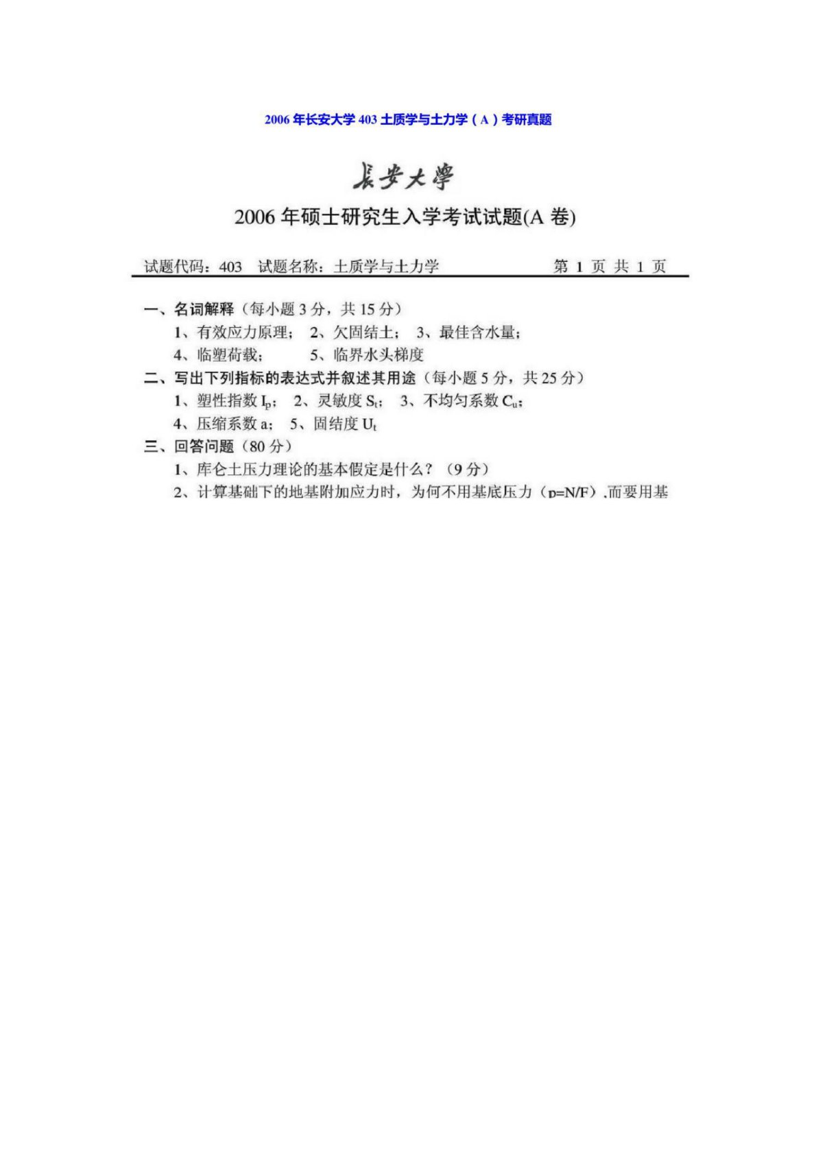 长安大学801土力学2006年真题