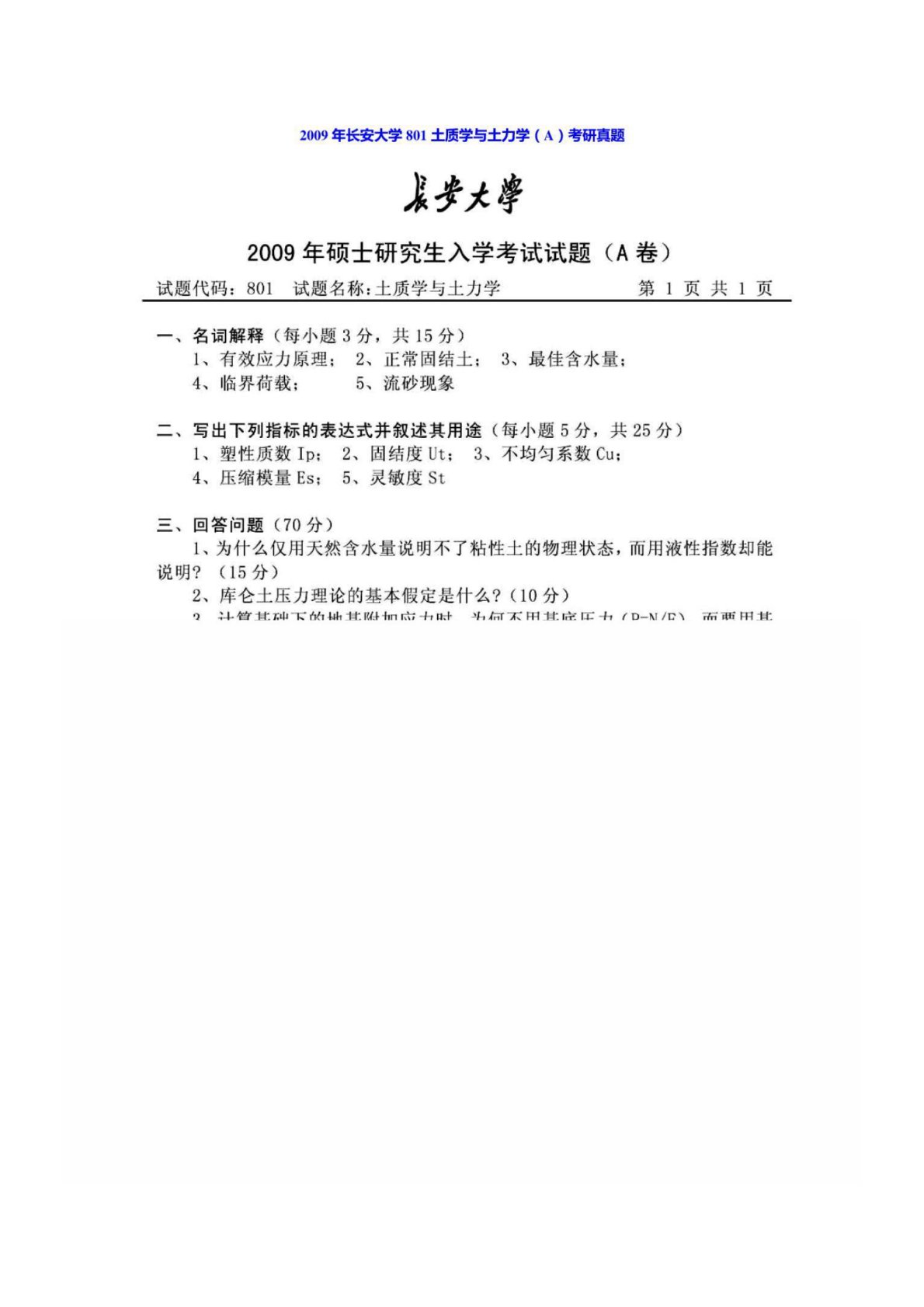 长安大学801土力学2009年真题
